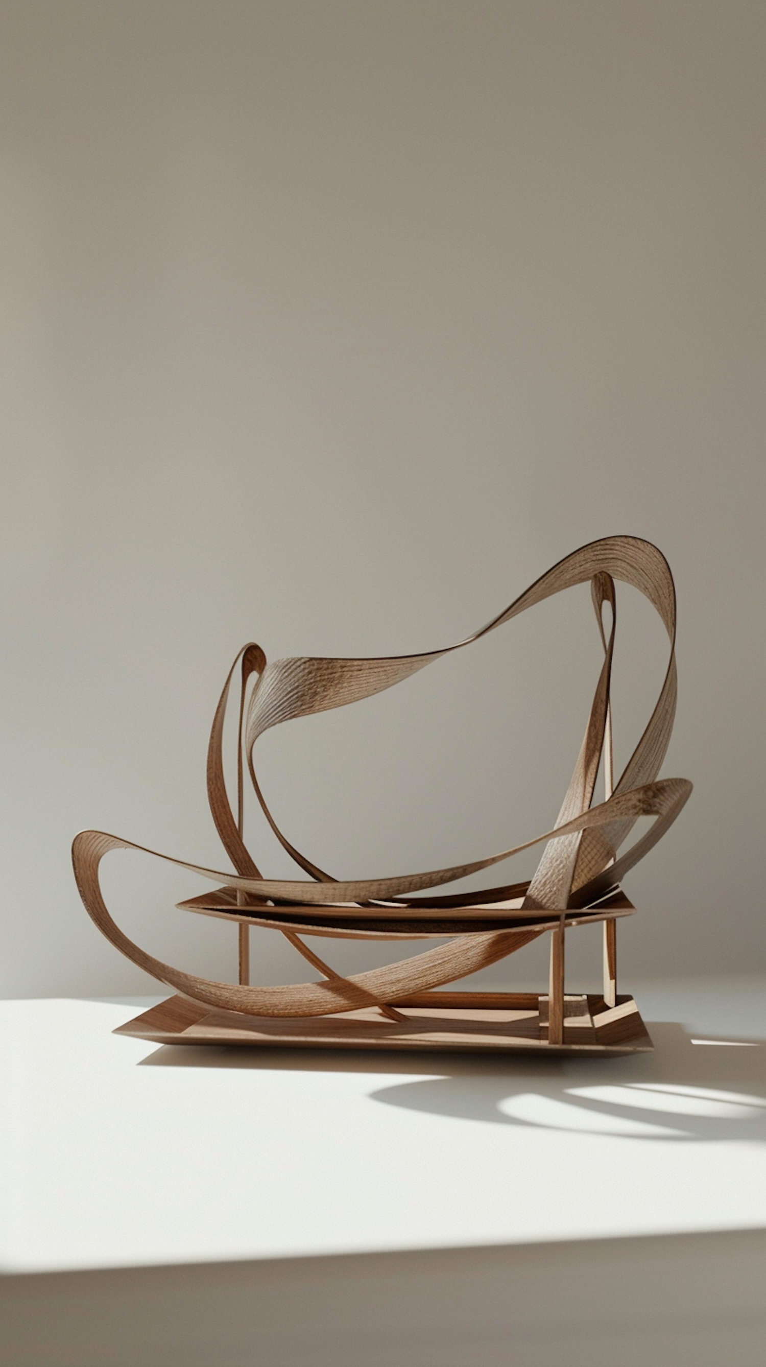 Elegant abstract wooden sculpture with intertwining curves on a minimalist background, showcasing fluid design and natural wood texture.