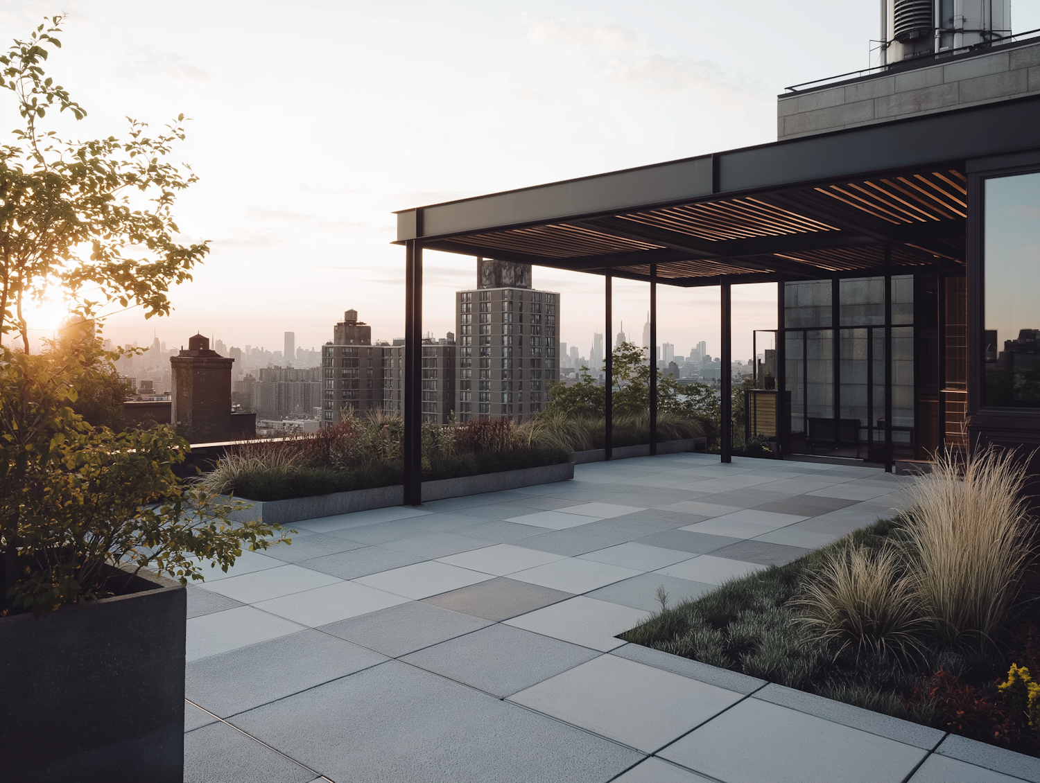 Modern rooftop terrace with sleek tiles, lush planters, and a pergola overlooking a stunning cityscape at sunset.