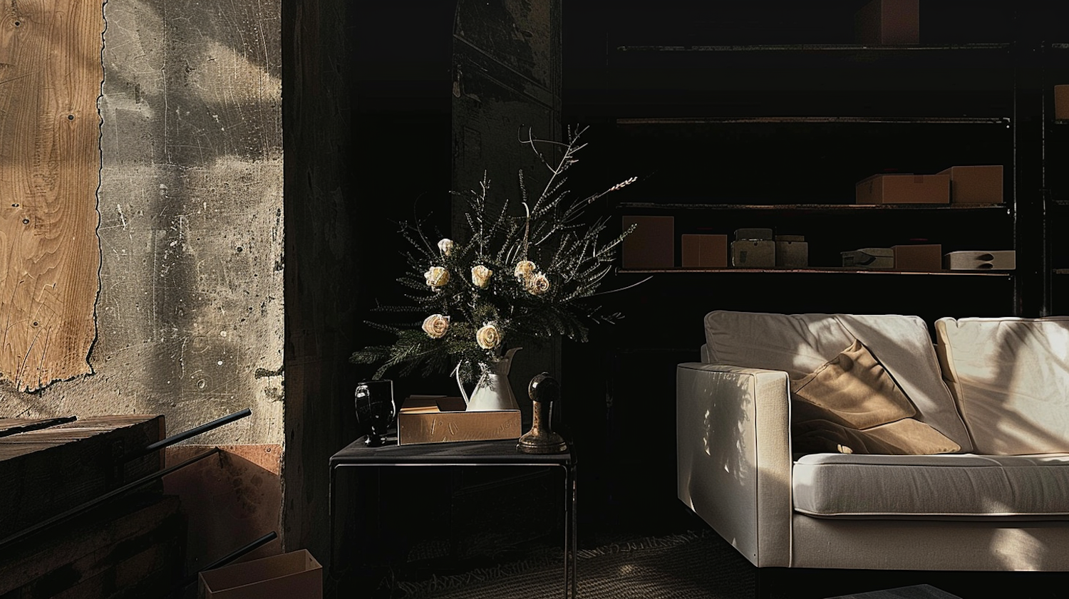 Cozy room with white sofa, cream roses in a vase, and rustic wall. Modern decor with soft lighting and industrial touches.
