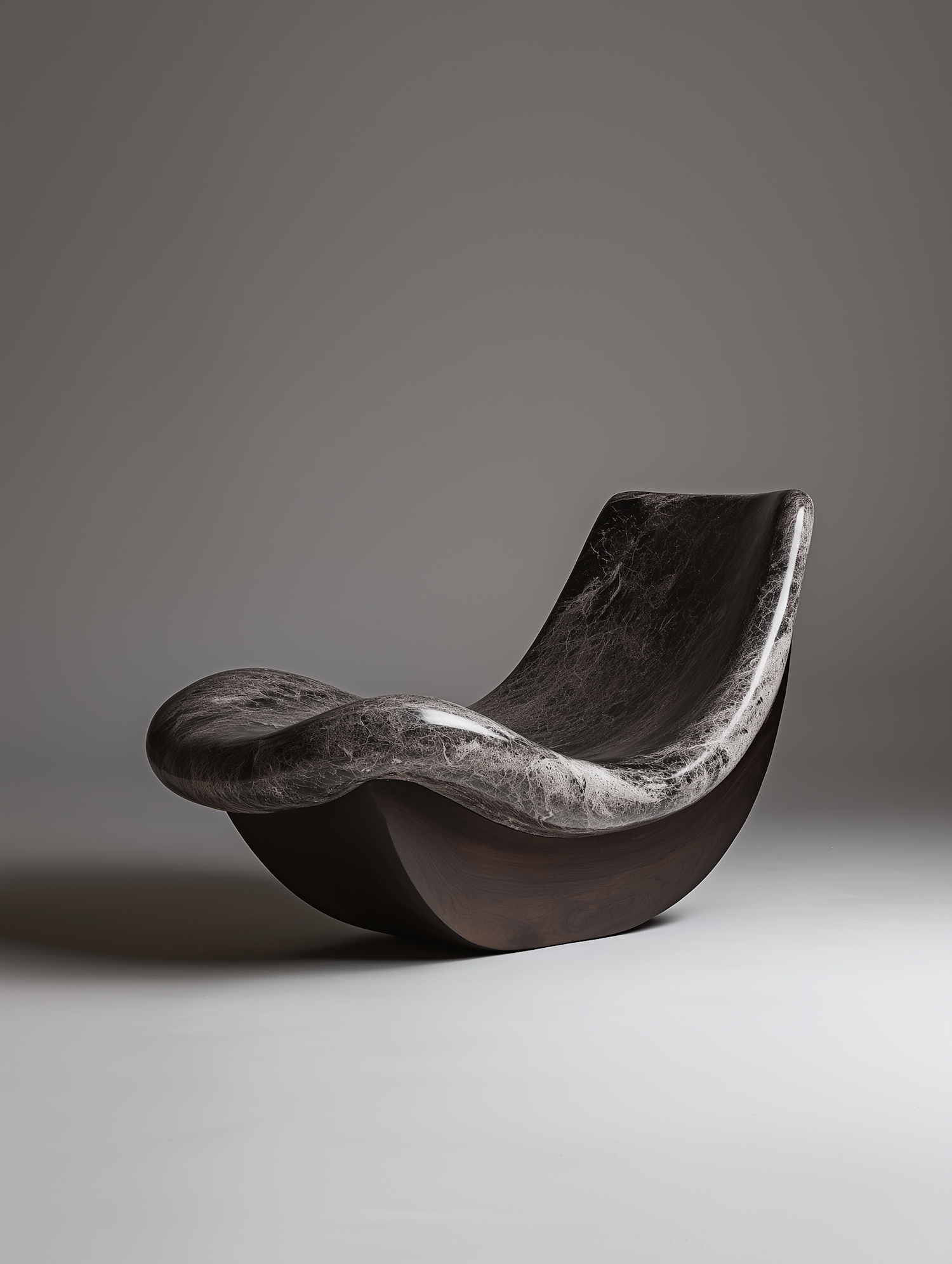 Sleek, modern chair with dark marbled design and flowing curves, set against a neutral background. Luxurious and elegant furniture piece.