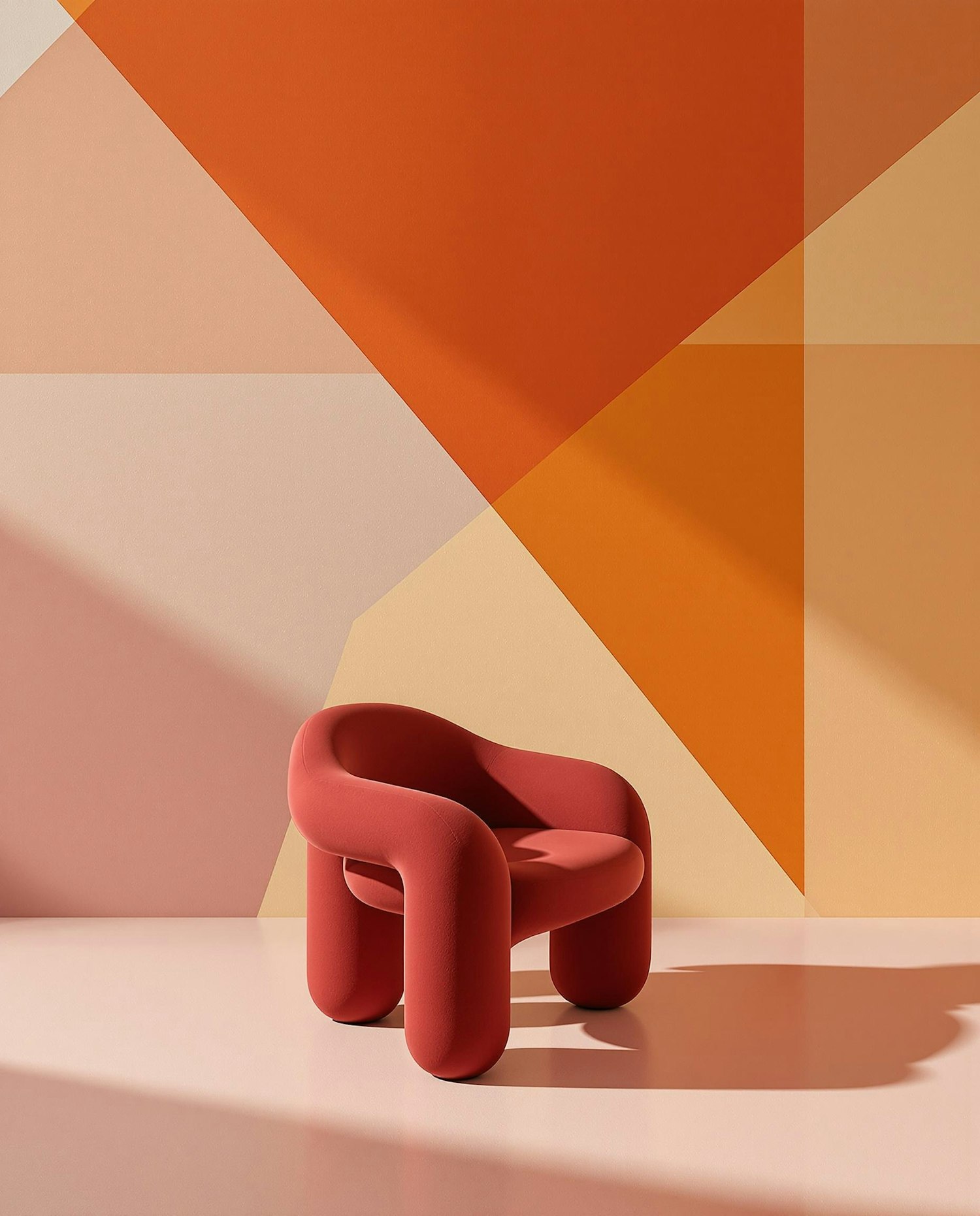 editorial product photo, dramatic studio lighting with soft shadows, carefully styled composition, sculptural object focus, bold modern background in expressive color or texture, refined materials, high contrast, clean lines, minimal-maximal art direction, luxury design magazine aesthetic a sculptural armchair in matte dark red with thick rounded legs, placed on a light pink concrete floor, background wall with a geometric mural in warm orange and cream