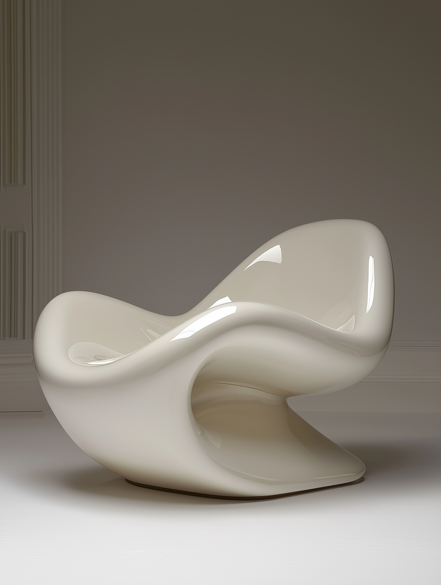 Sculptural cream chair with a glossy finish and flowing design, set against a minimal neutral background.