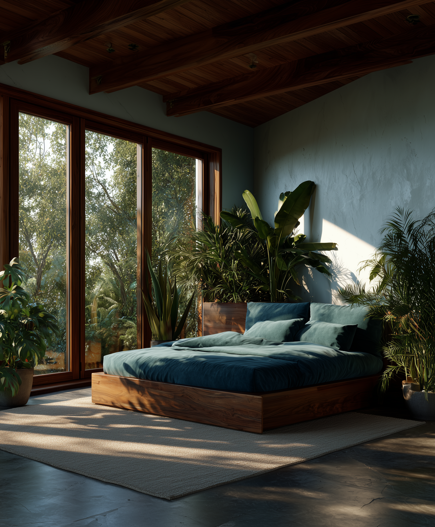 Modern bedroom with teal bedding, wooden accents, lush indoor plants, and large windows letting in natural light.