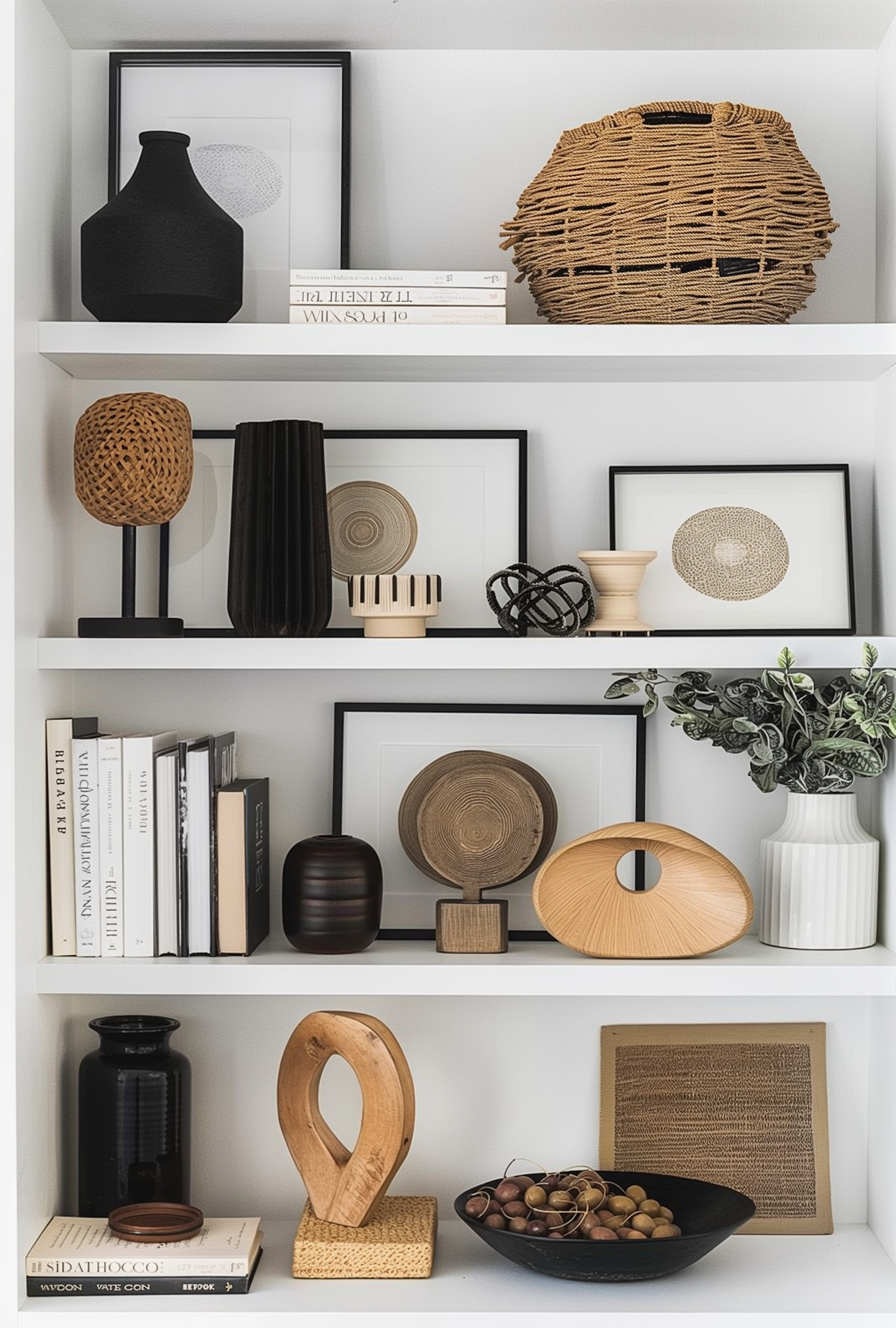Stylish white shelves with modern decor, including wooden sculptures, vases, books, and abstract art, creating a cozy and elegant vibe.