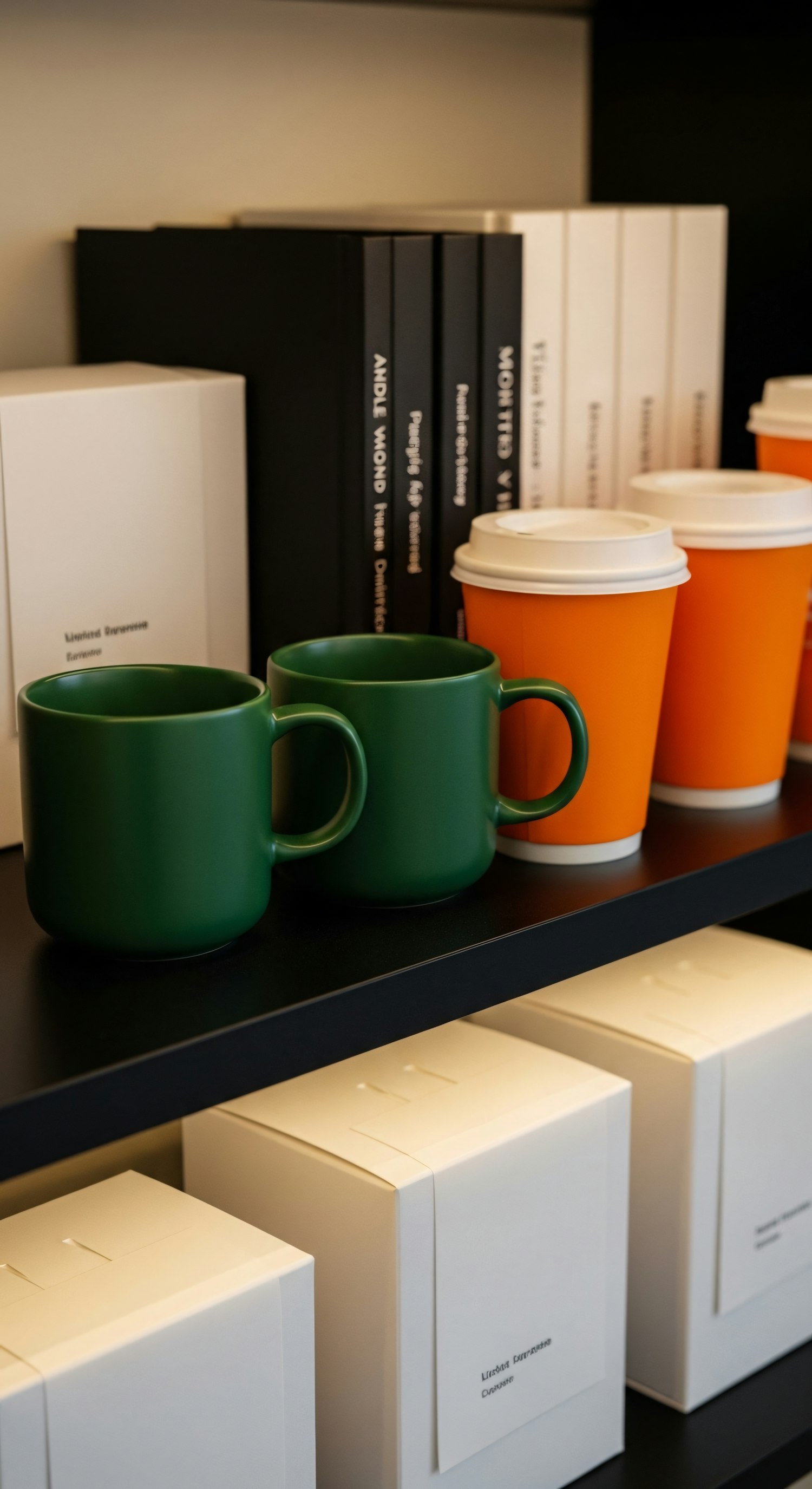 A modern shelf setup with green mugs, orange coffee cups, and minimalist books and boxes, creating a clean and stylish aesthetic.