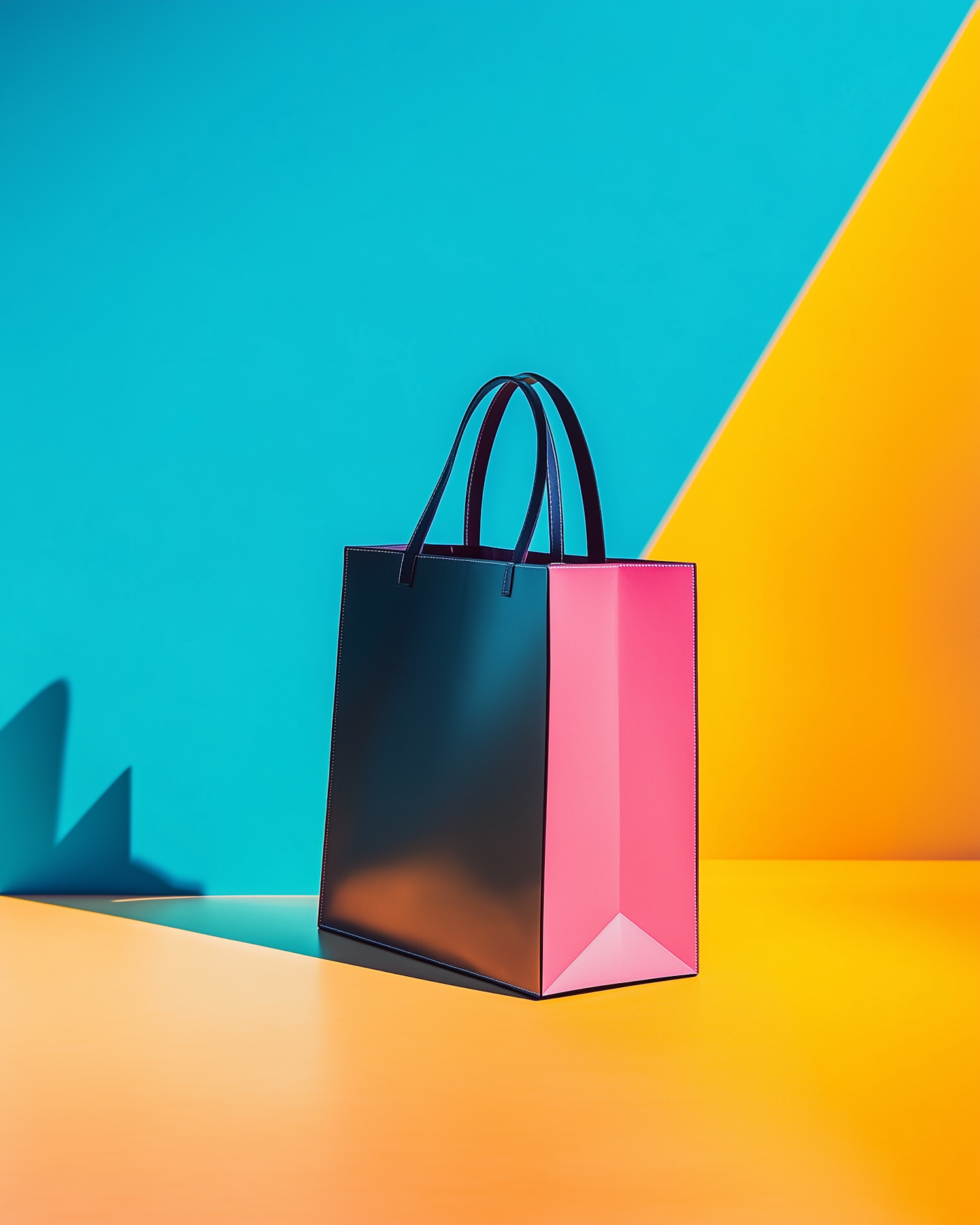Modern shopping bag with black and pink panels against a vibrant turquoise and yellow geometric background.