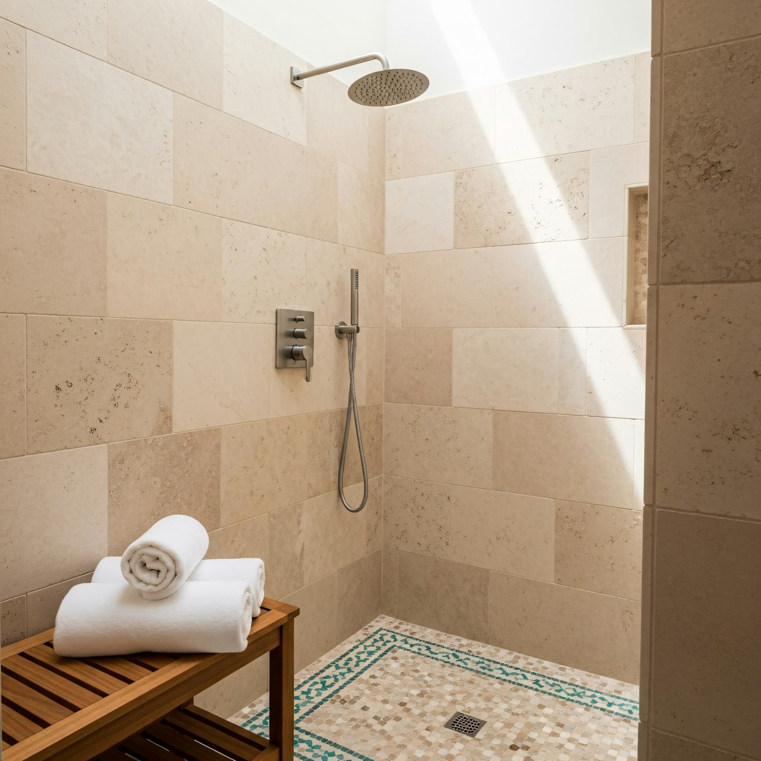 Elegant shower with beige stone tiles, mosaic floor, rainfall showerhead, and a wooden bench with white towels. Bright and modern design.