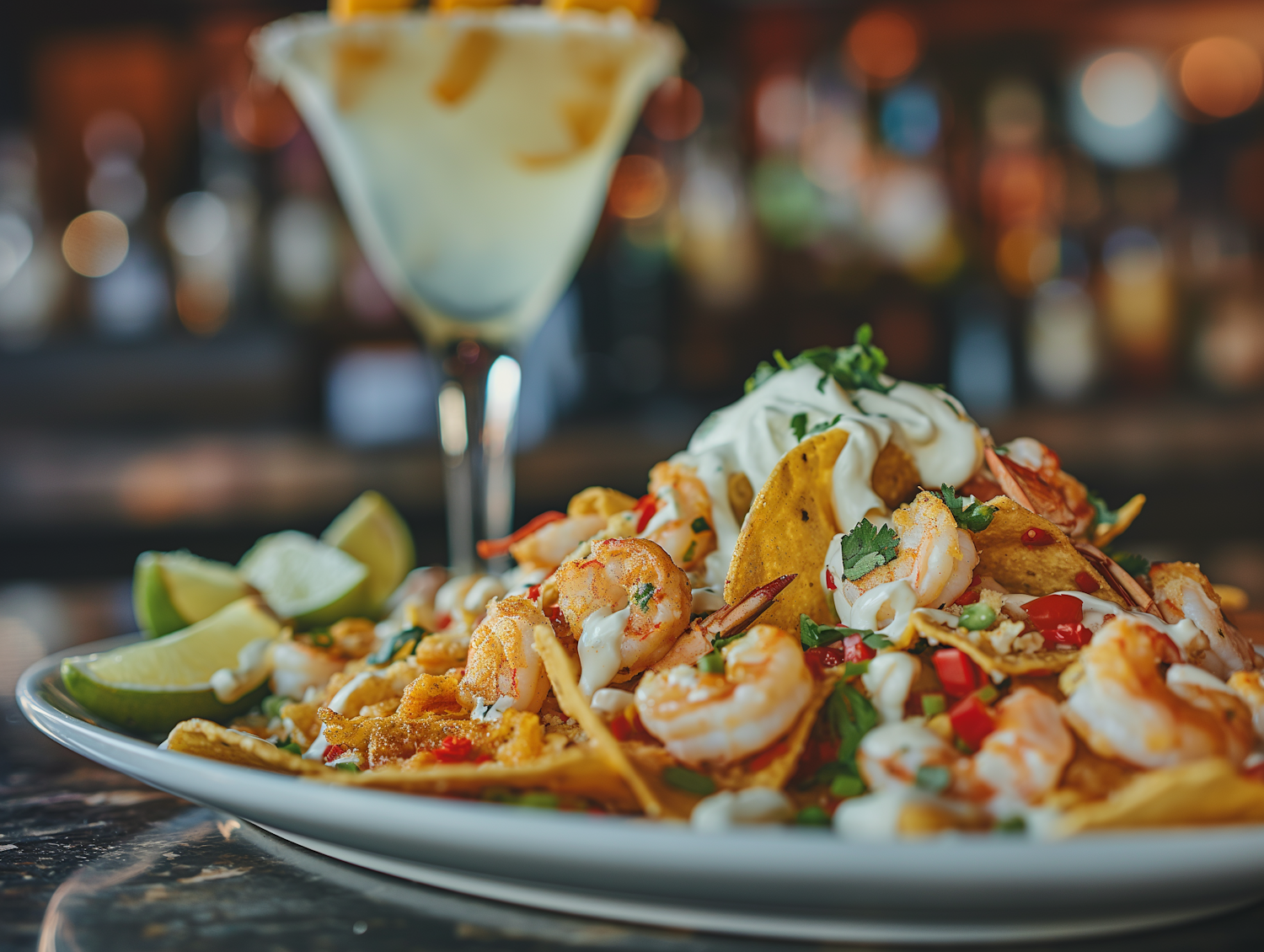 Delicious shrimp nachos with creamy sauce and lime wedges, paired with a refreshing margarita in a lively bar setting.