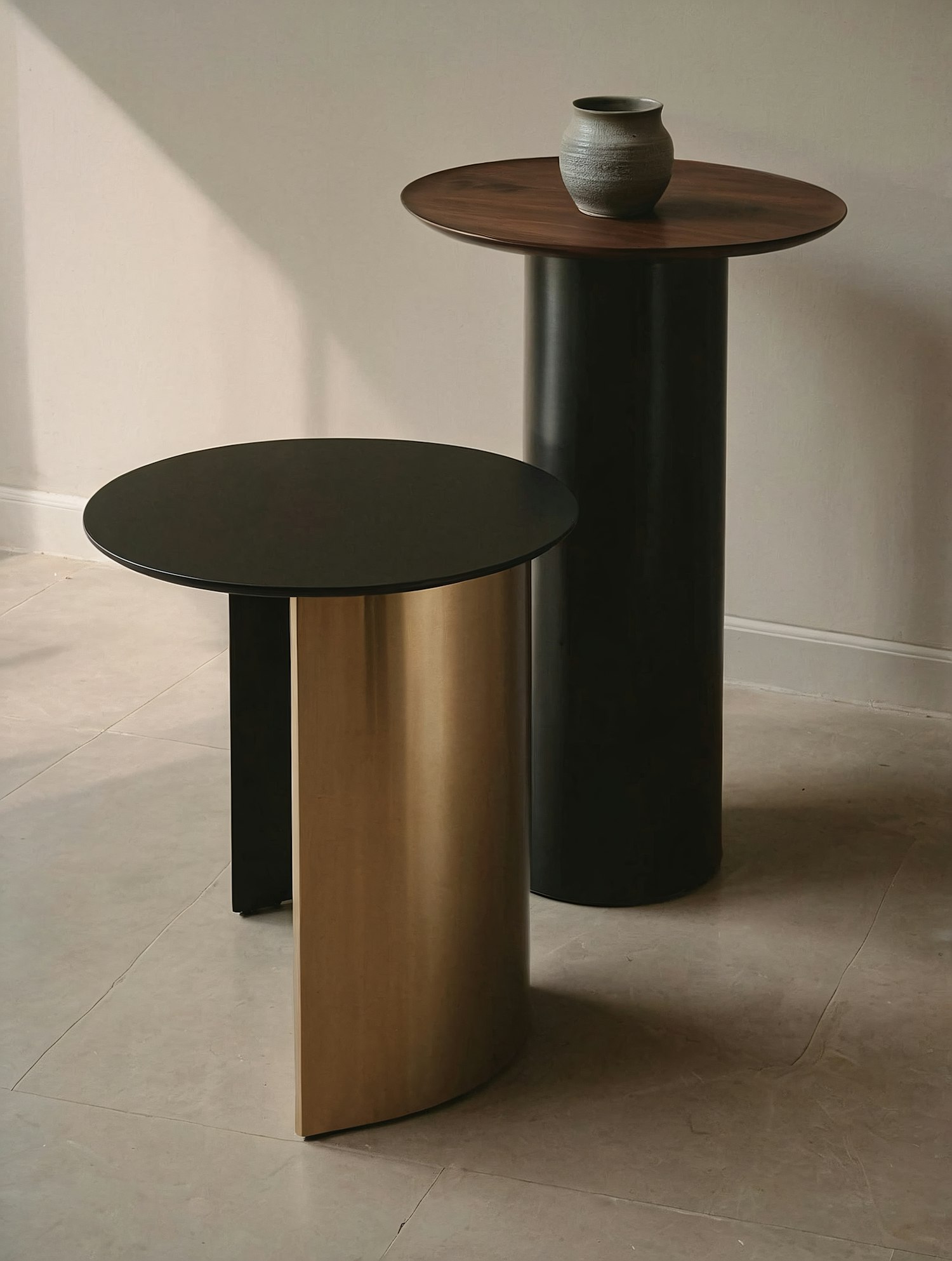 Minimalist side tables with black, gold, and wood finishes, paired with a ceramic vase in a softly lit modern interior.