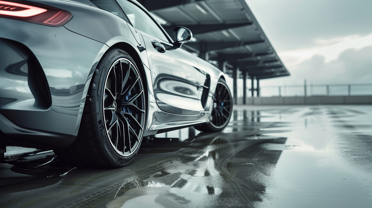 Sleek silver sports car with black alloy rims on a wet surface, reflecting a modern structure and cloudy sky.