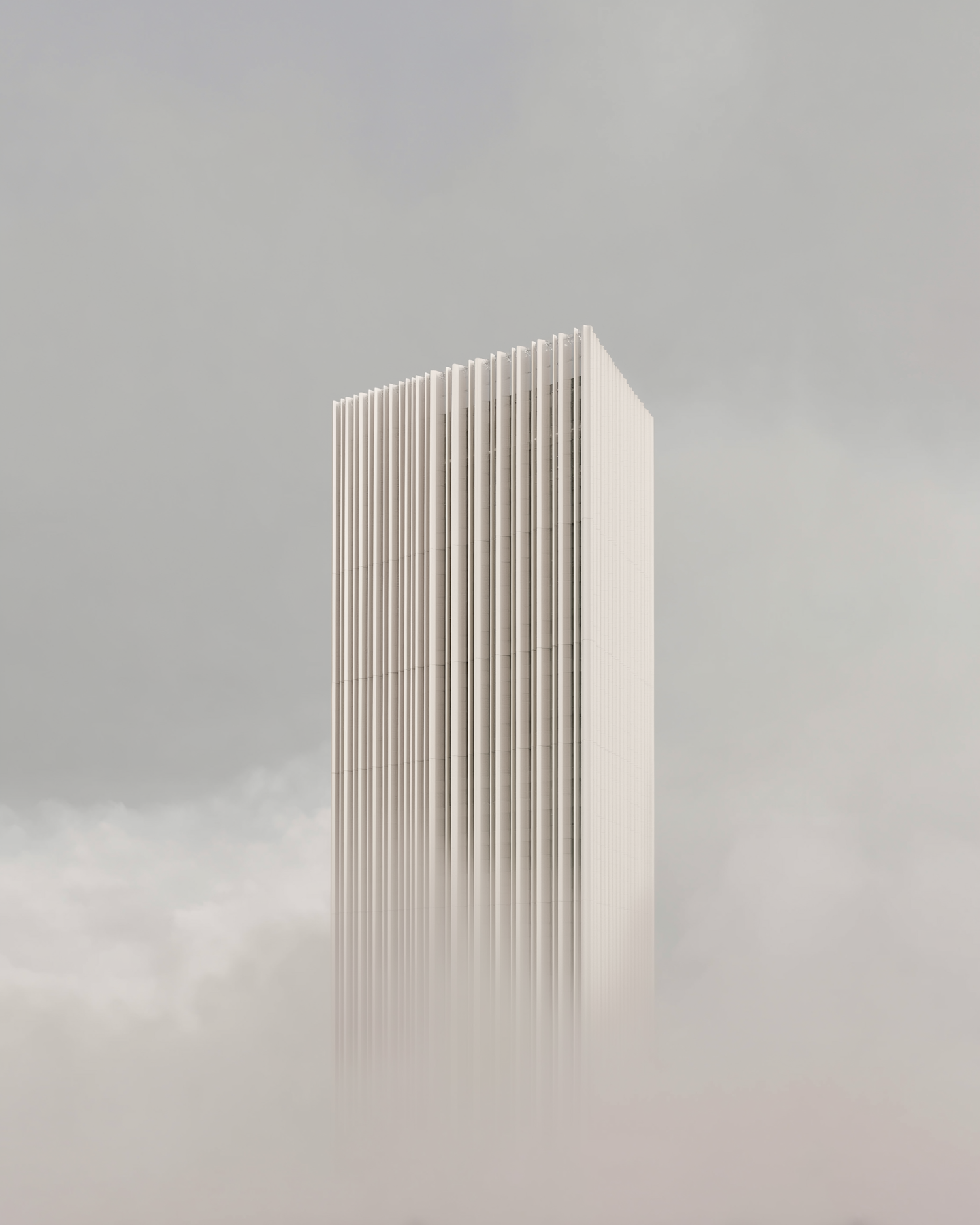 A sleek, minimalist skyscraper emerges from the fog, its vertical lines and neutral tones creating a striking modern aesthetic.