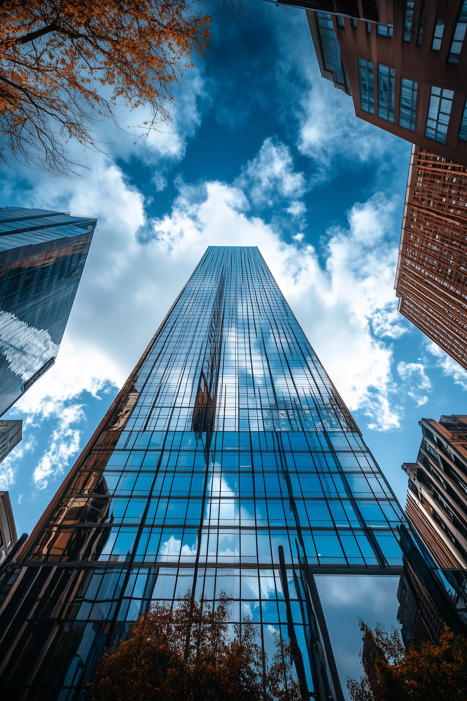 Stunning upward view of a skyscraper reflecting blue skies and clouds, framed by modern buildings and autumn trees.