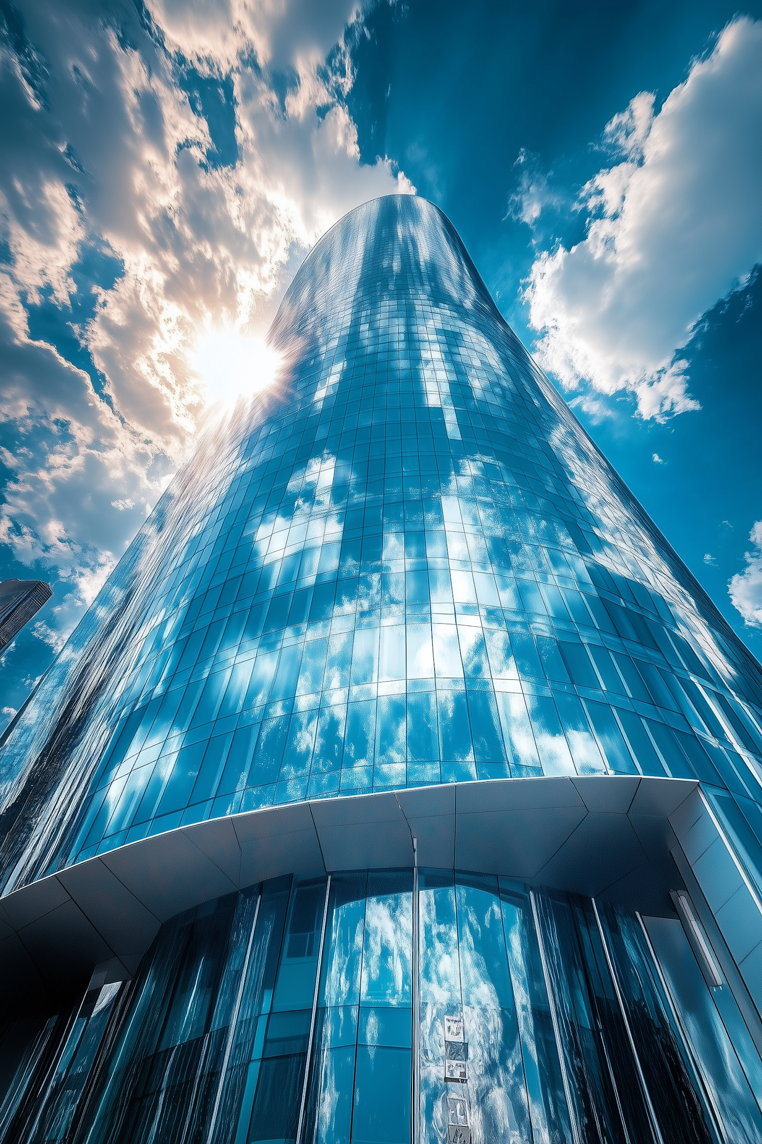 Stunning skyscraper with reflective glass facade against a vibrant blue sky and clouds, capturing modern architecture and natural beauty.