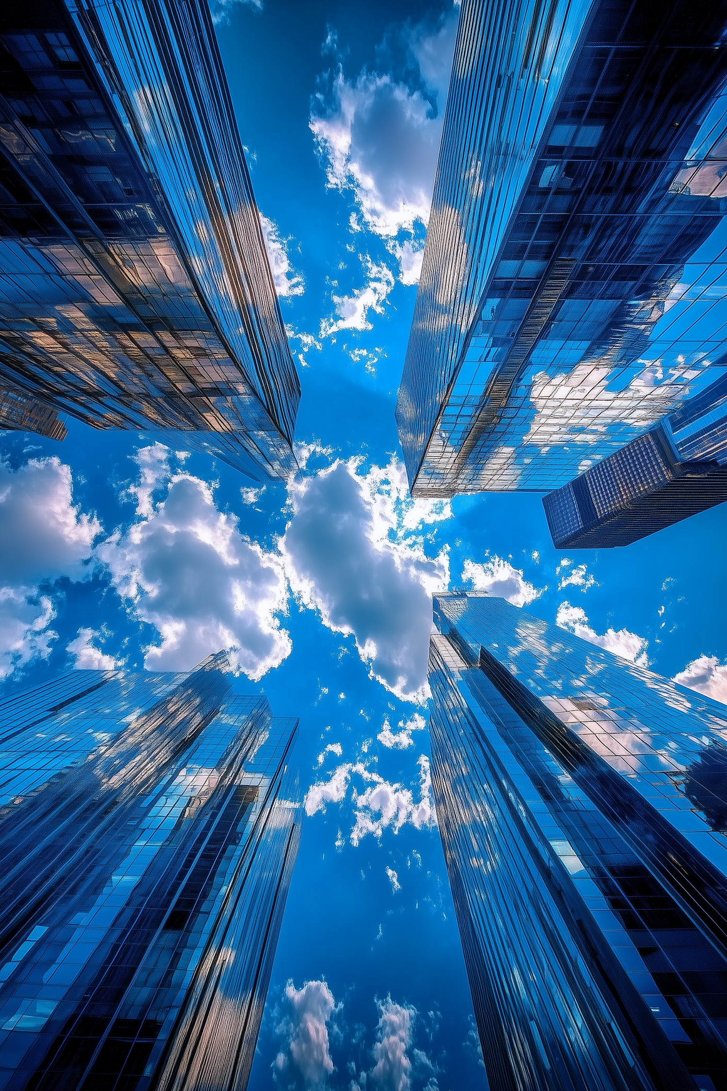 Skyscrapers with reflective glass facades against a bright blue sky with clouds, creating a modern urban scene.