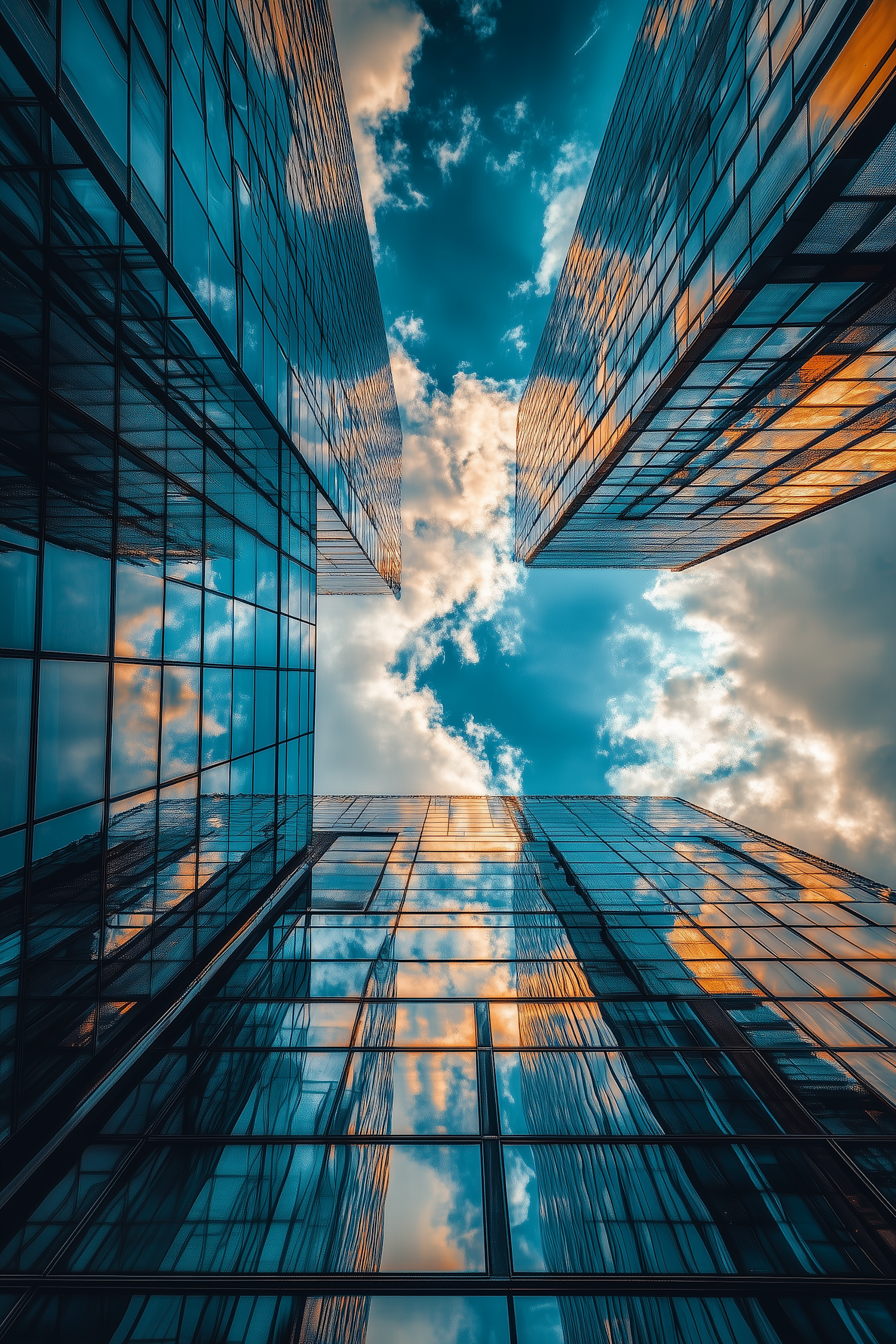 Stunning upward view of glass skyscrapers reflecting a vibrant sunset sky, creating a dramatic and symmetrical urban scene.