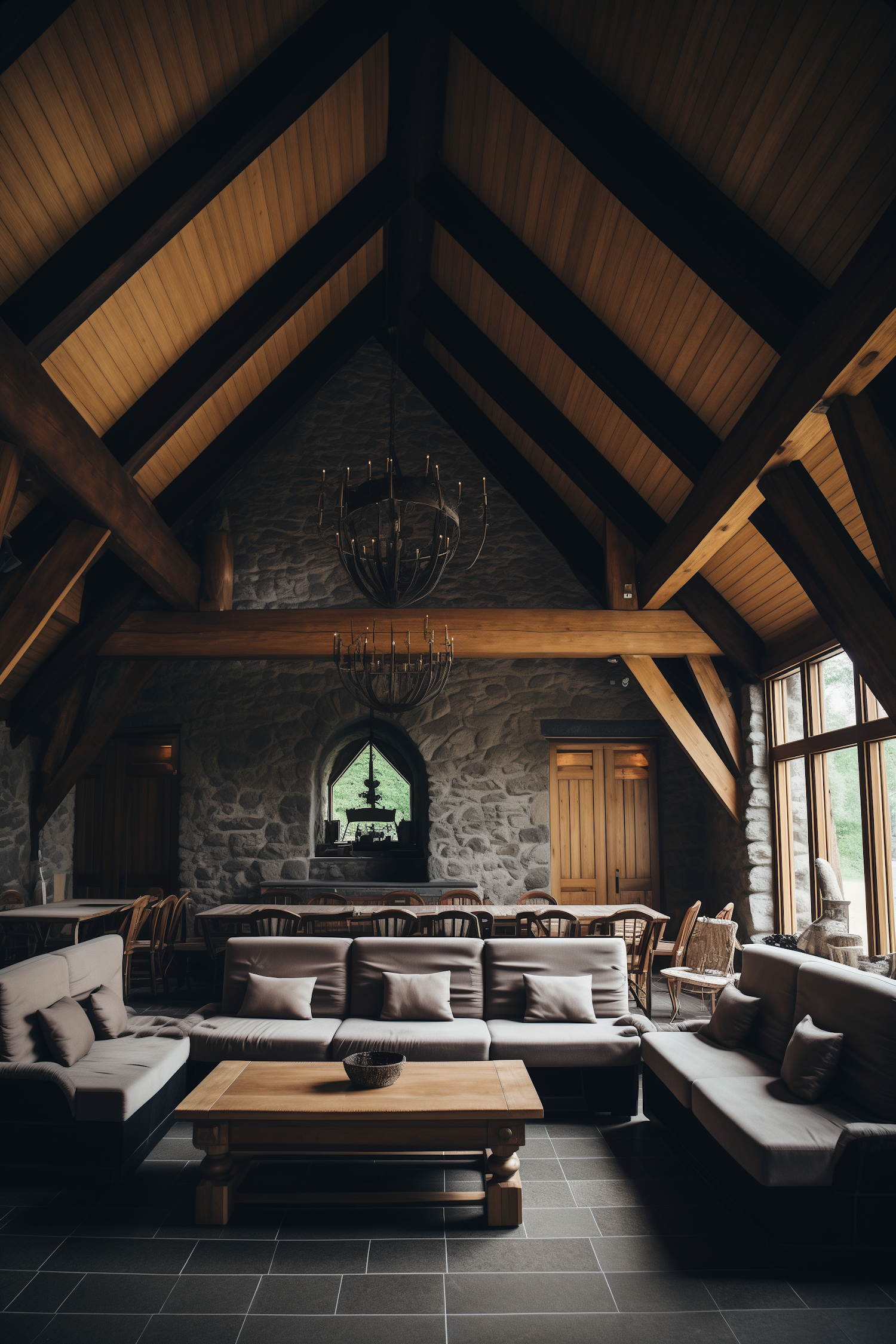 Rustic interior with vaulted ceiling, stone walls, and cozy seating. Large windows and chandeliers add elegance and warmth.