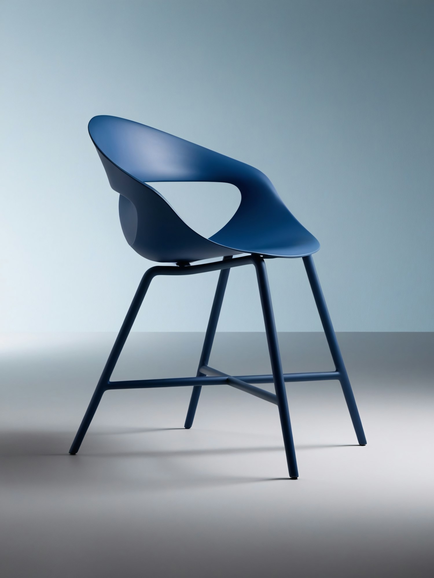 Sleek modern chair with a minimalist design in matte blue, featuring a curved backrest and angled legs against a soft blue background.