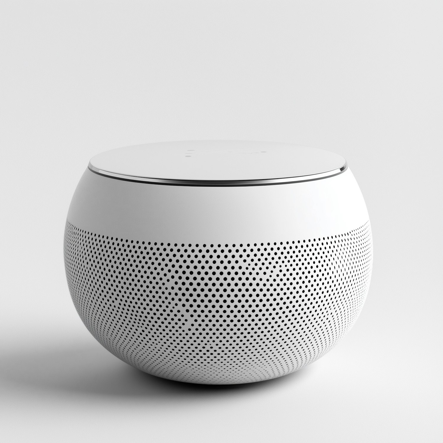Minimalist white spherical smart speaker with perforated design, touch controls, and metallic accents for a sleek, modern look.
