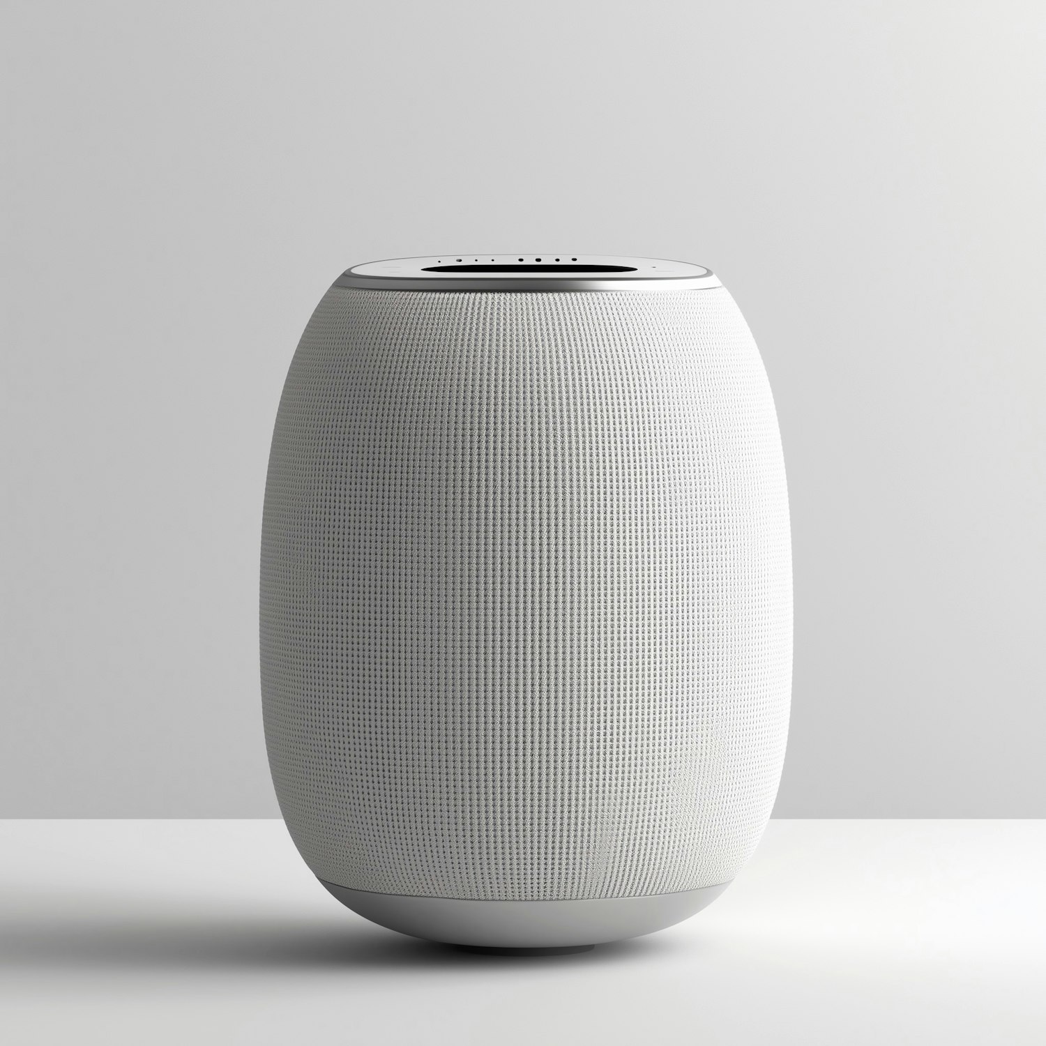 Minimalist white smart speaker with a textured fabric body and touch-sensitive controls, perfect for modern home setups.