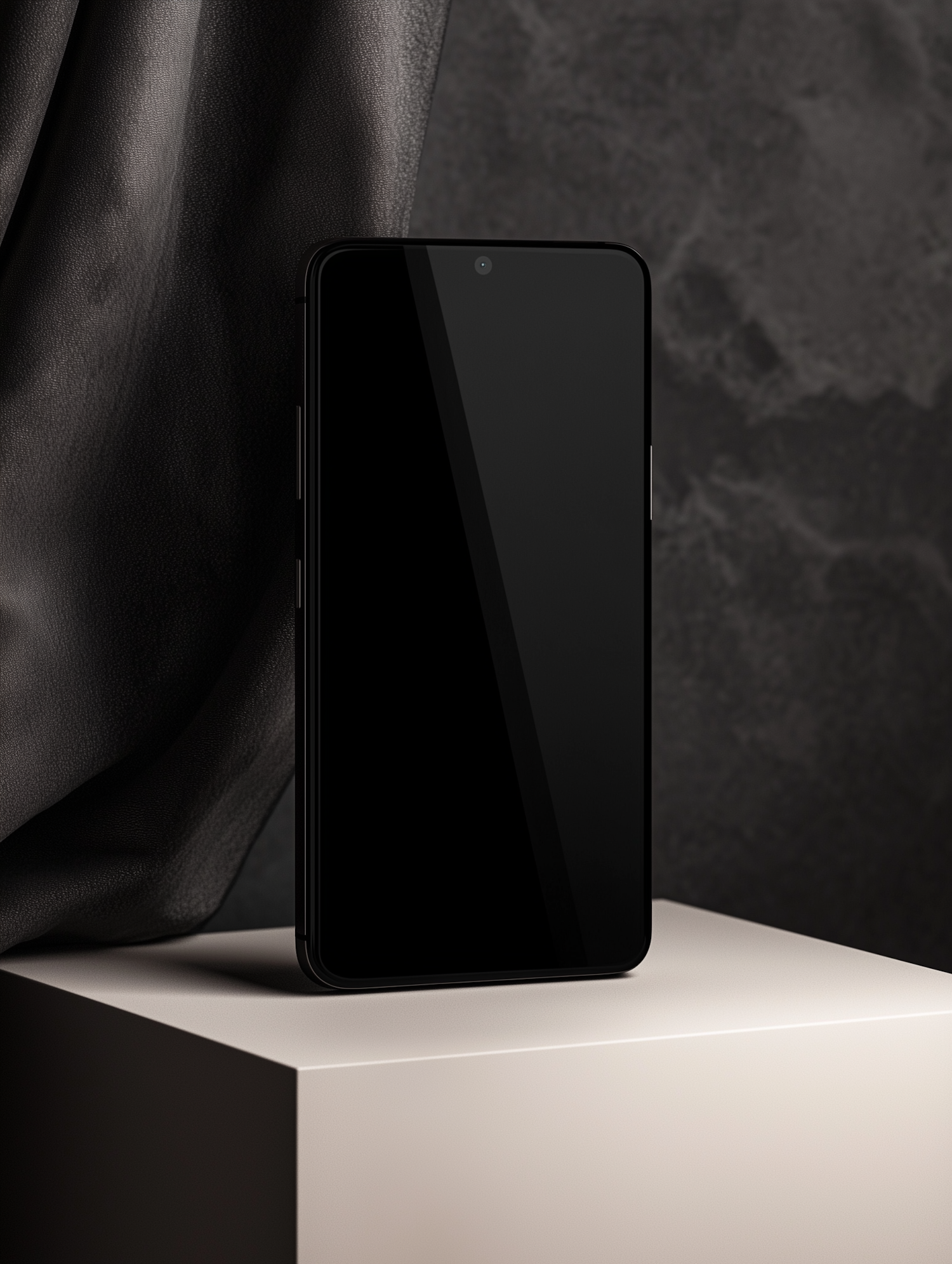 Minimalist black smartphone on a white pedestal with a textured dark background, showcasing a sleek and modern design.