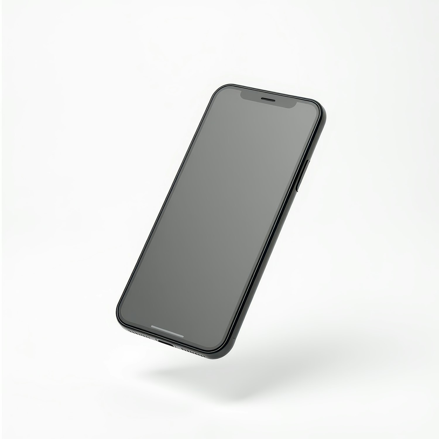 Sleek black smartphone with a reflective screen, angled against a white background, showcasing modern design and elegance.
