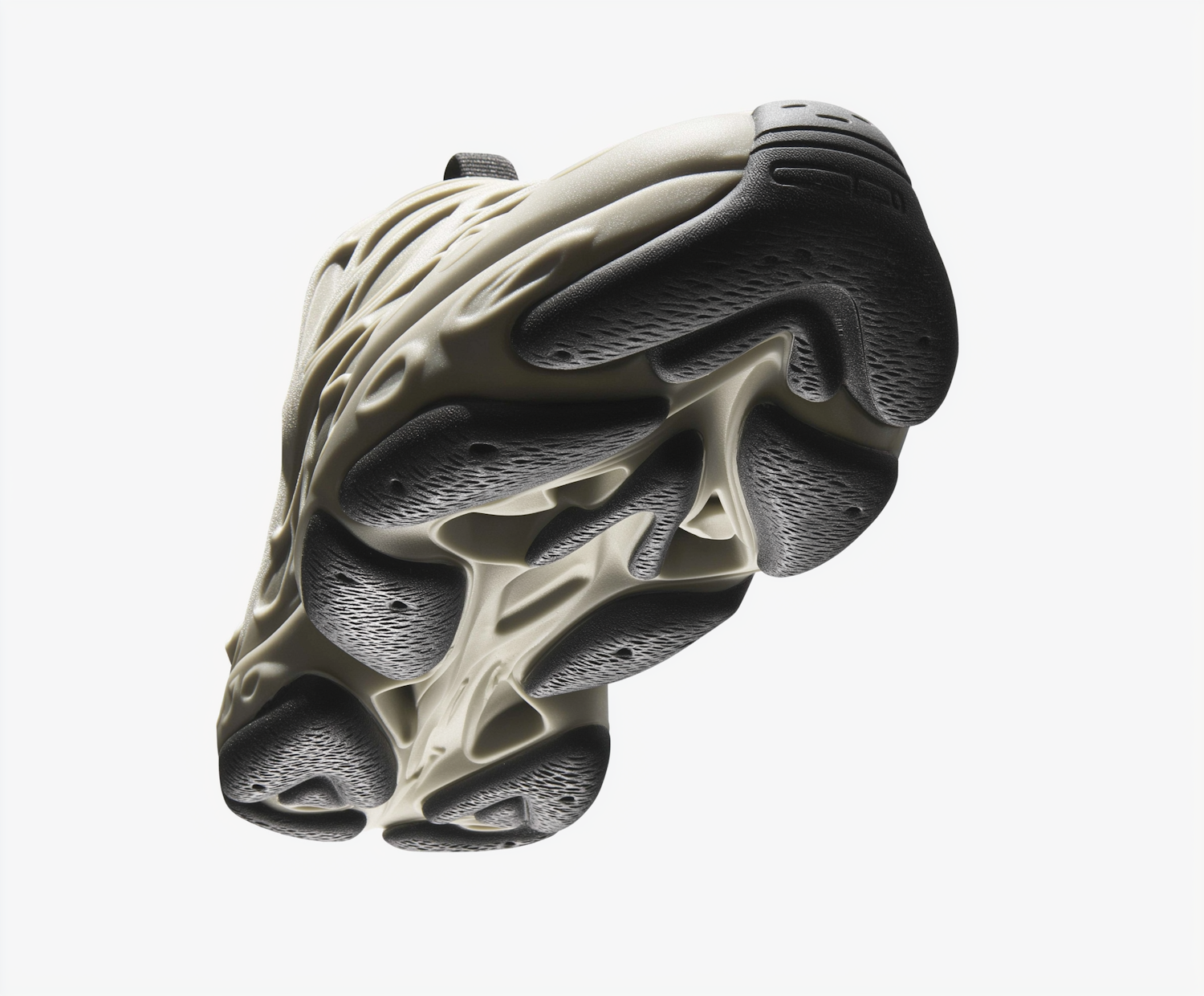 Close-up of a sneaker sole with a modern, sculpted design in black and beige tones, emphasizing texture and innovative style.
