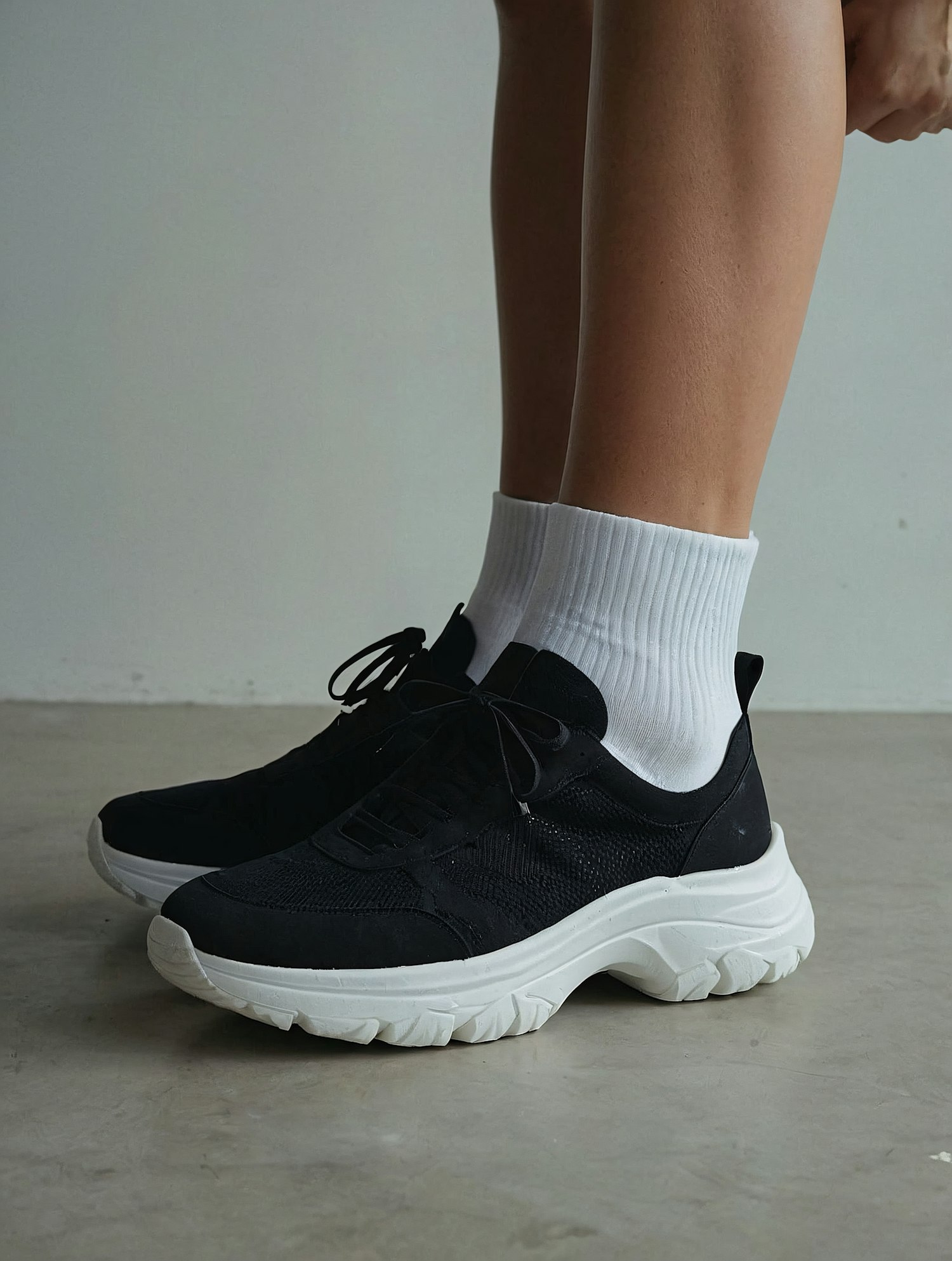 Close-up of black sneakers with chunky white soles paired with white ribbed socks on a minimalist gray background.