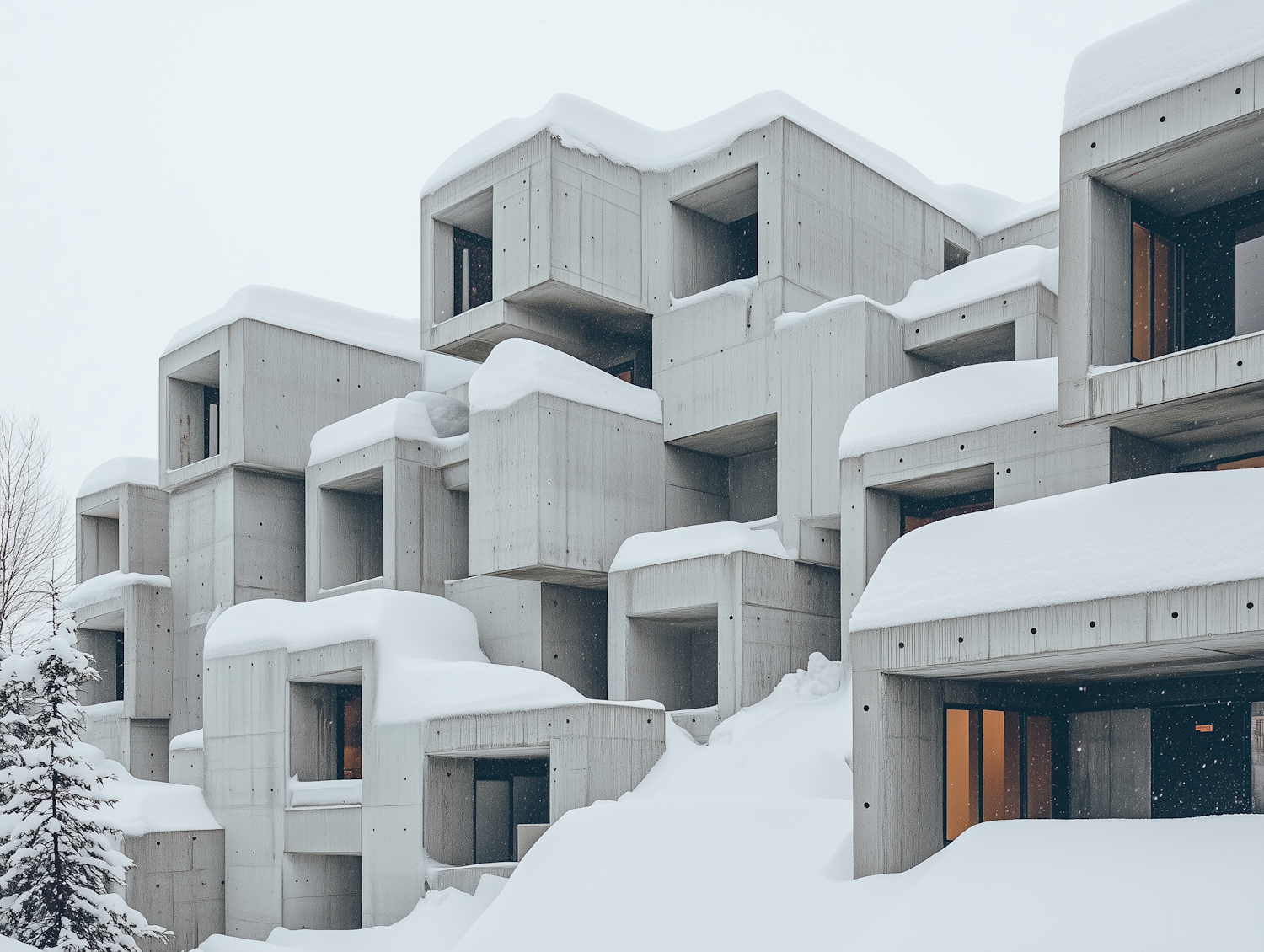 Modern concrete modular buildings covered in snow, with warm lights glowing from windows, creating a cozy winter scene.