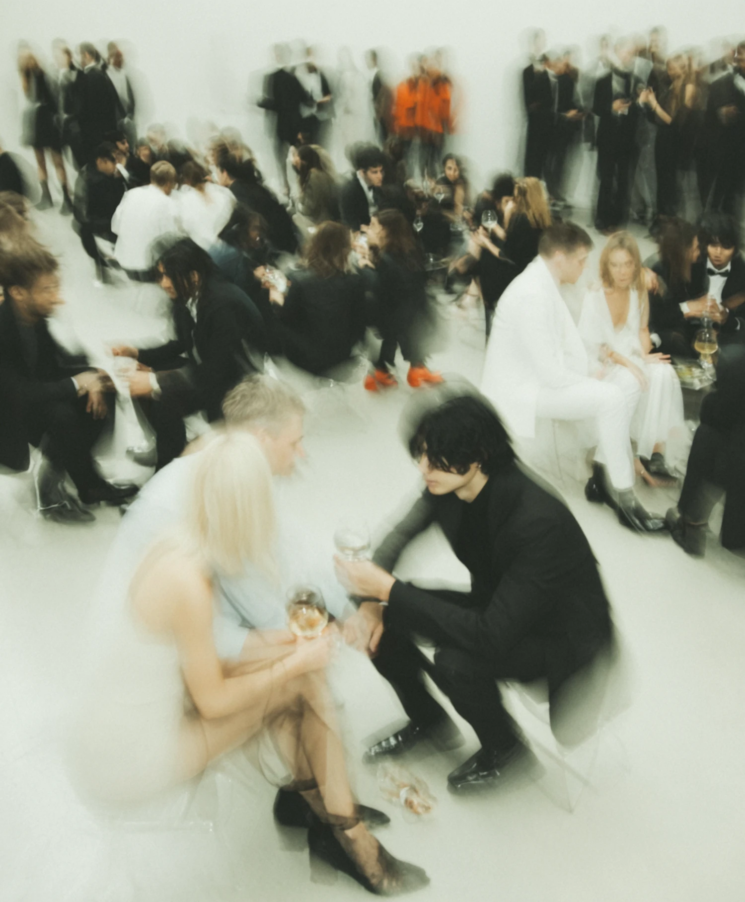 A dynamic and stylish social gathering with attendees in formal attire, captured with a blurred effect for a lively atmosphere.