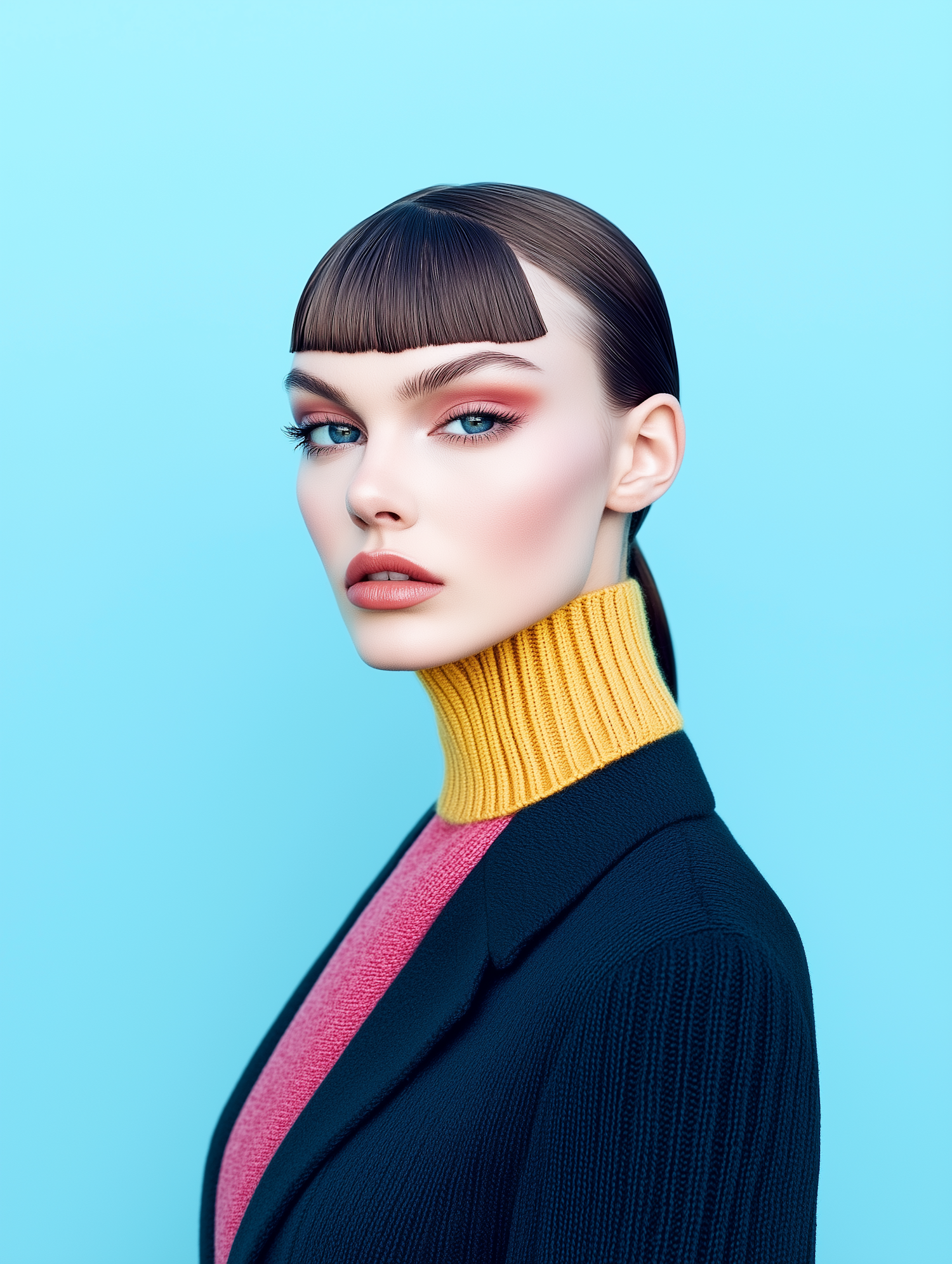Stylish woman with sleek hair and bold makeup in a mustard sweater and black jacket against a light blue background.