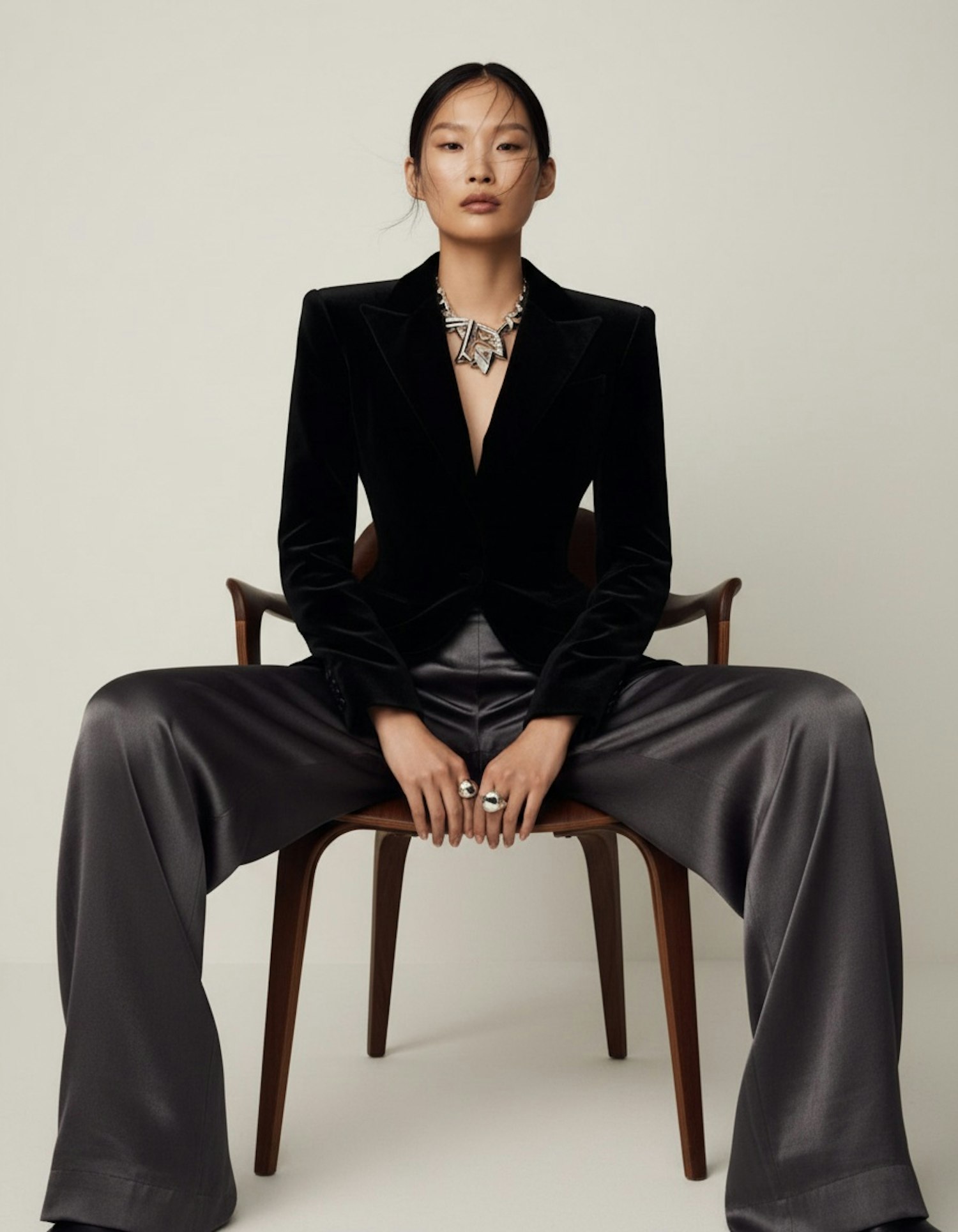 A stylish individual in a black blazer and gray trousers sits confidently, accessorized with a bold necklace and rings, against a neutral backdrop.