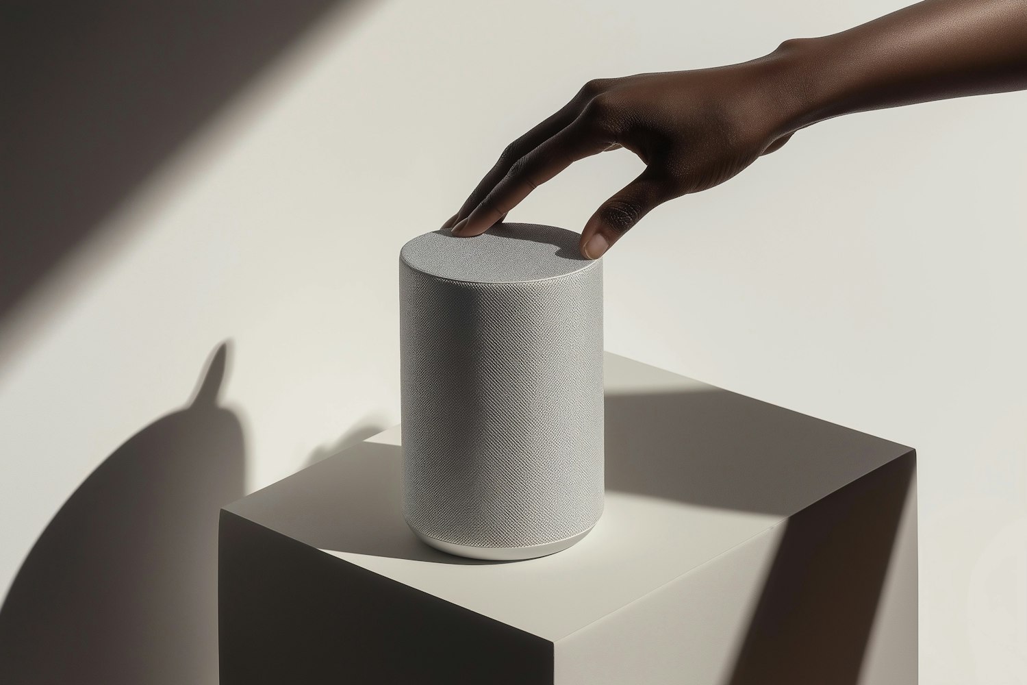 Elegant smart speaker on a pedestal with a hand interacting, showcasing modern design and technology in a minimalist setting.