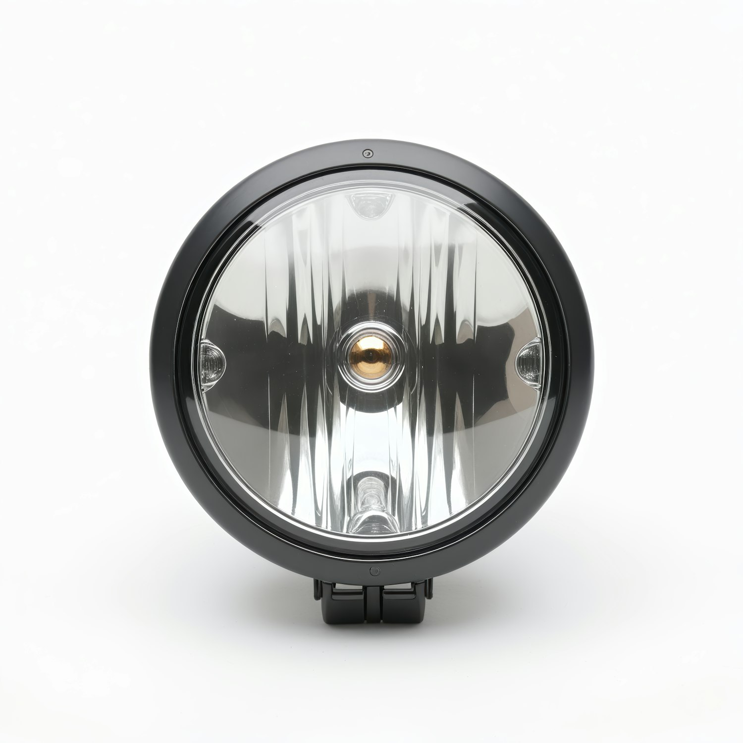 Round black-framed headlight with reflective lens and central bulb, designed for vehicle attachment, against a white background.