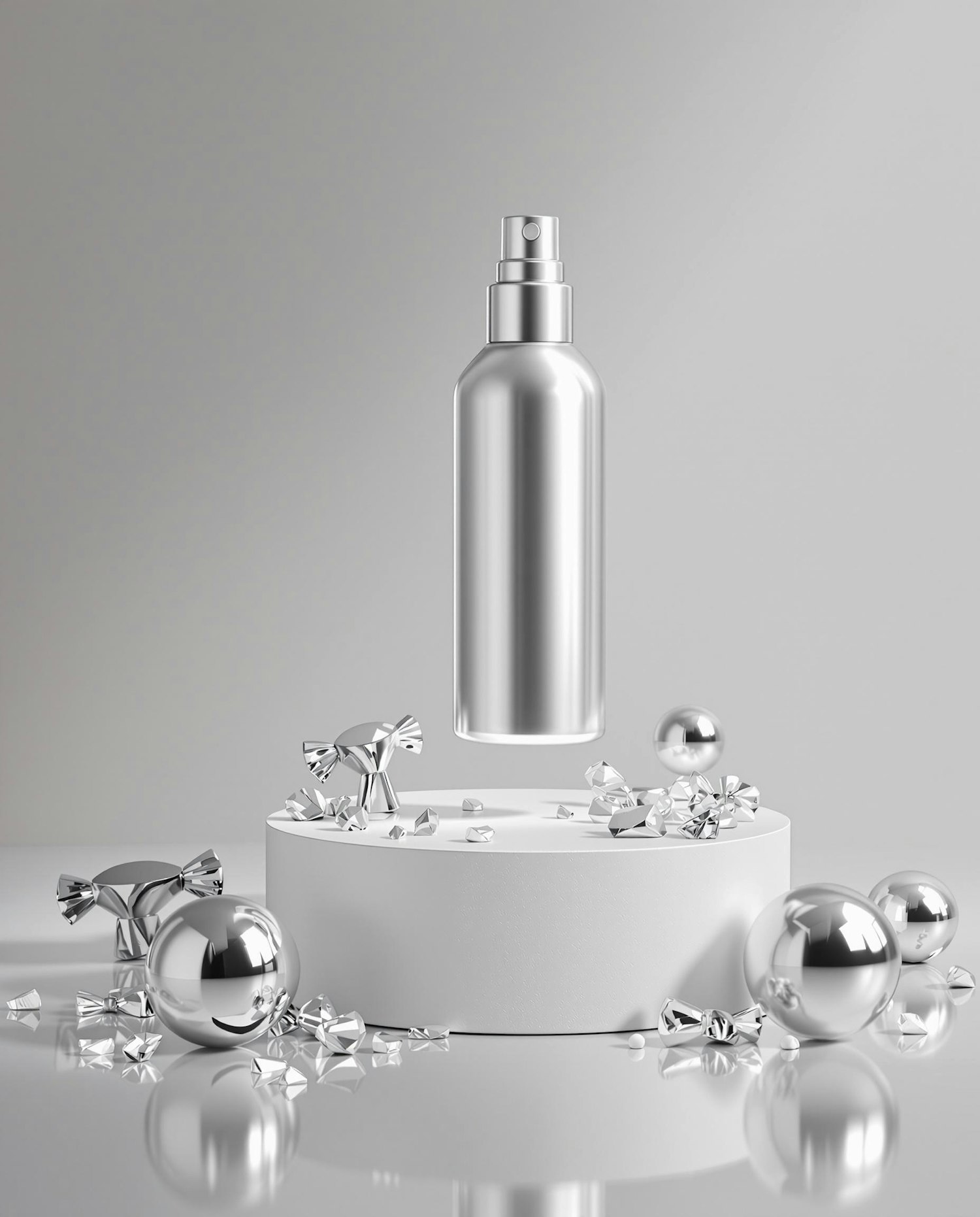 Metallic silver spray bottle suspended above pale grey pedestals, accompanied by chrome spheres and glossy candy pieces, sleek grey background, polished reflections and luxury editorial lighting, high-end product mockup
