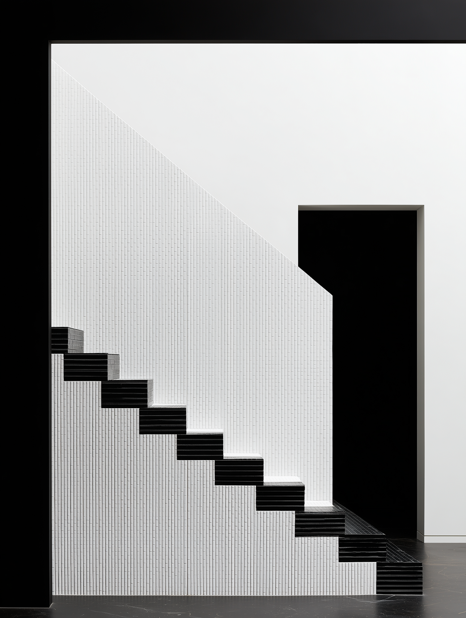 Modern staircase with black and white steps against a textured white wall, showcasing minimalist and geometric interior design.