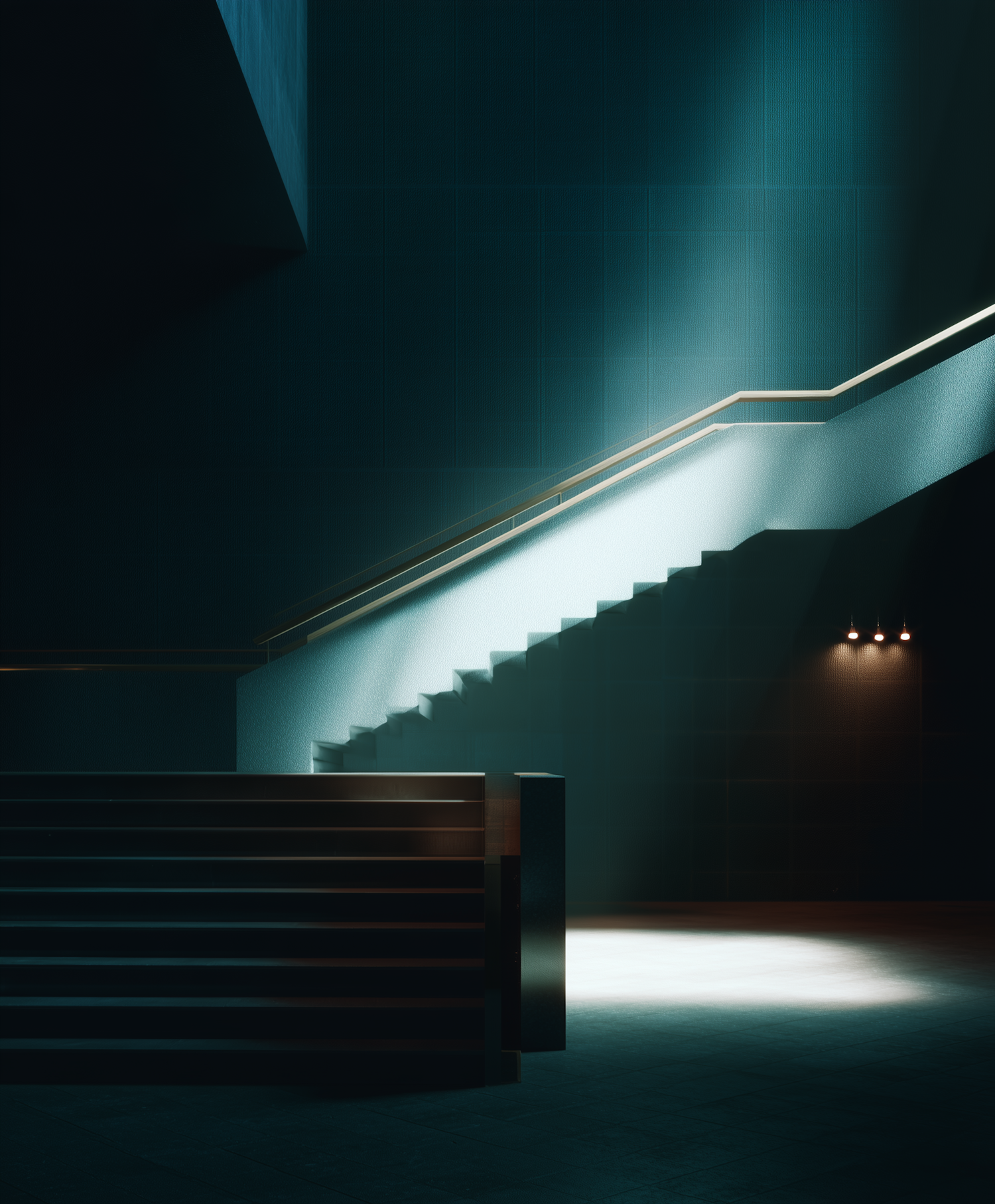 A modern staircase in a dimly lit interior, with dramatic lighting highlighting its sleek design and minimalist aesthetic.