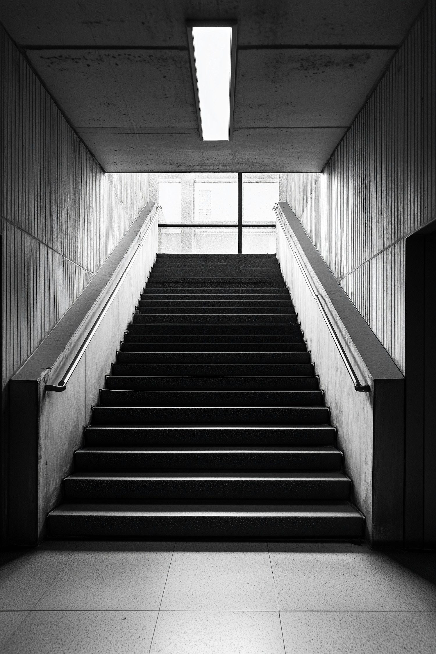 Monochrome staircase in a modern industrial building with sleek railings, grooved walls, and a large window at the top.