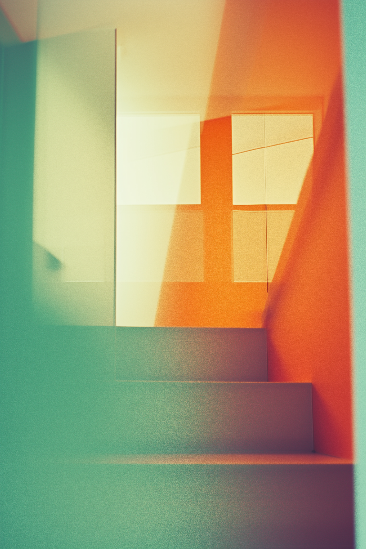 Abstract view of a modern staircase with vibrant orange and green walls, glass panels, and soft lighting for a contemporary aesthetic.