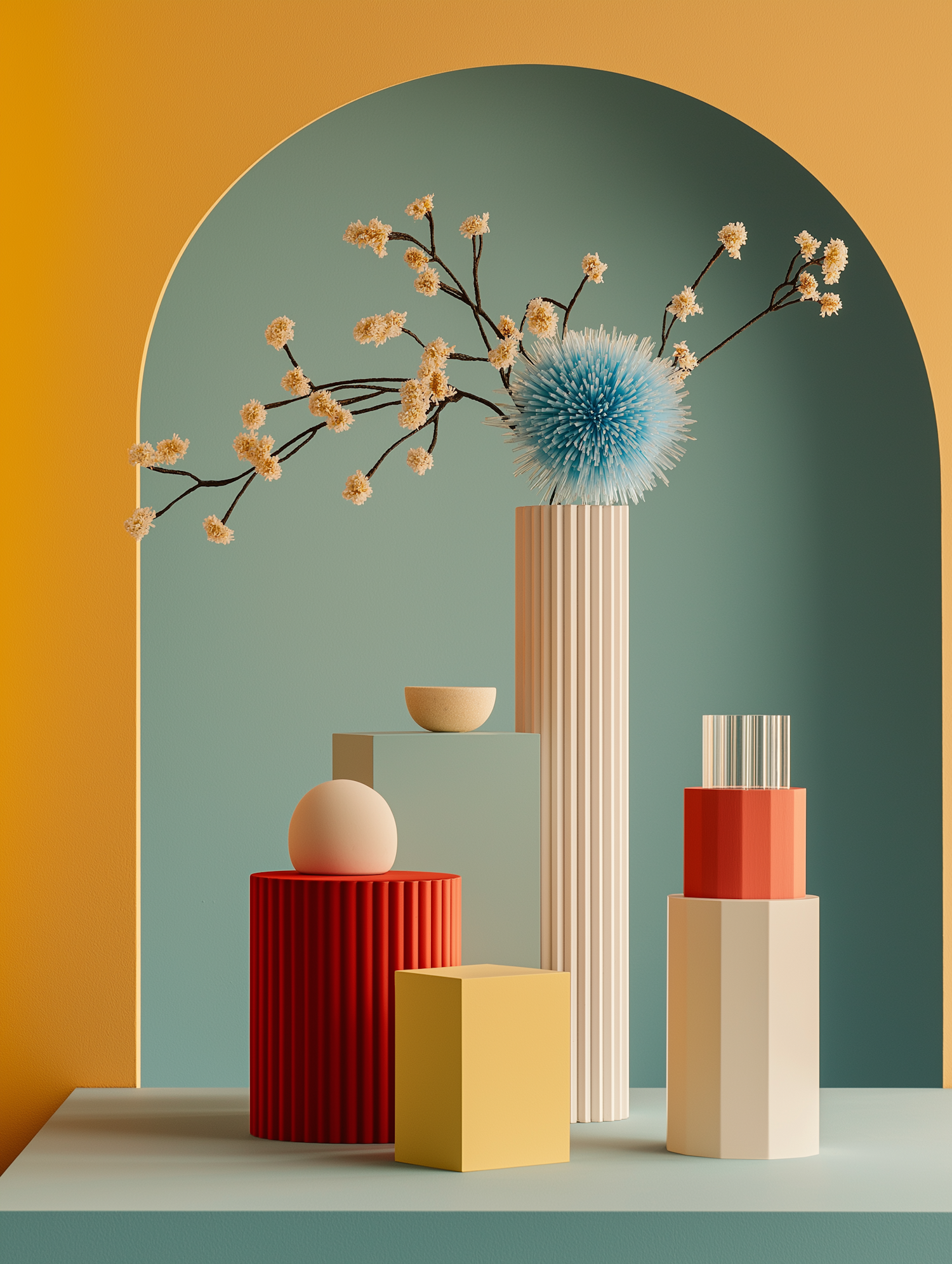 Modern still life with geometric shapes, a spiky blue sphere, and white blossoms on branches against a teal and mustard yellow backdrop.