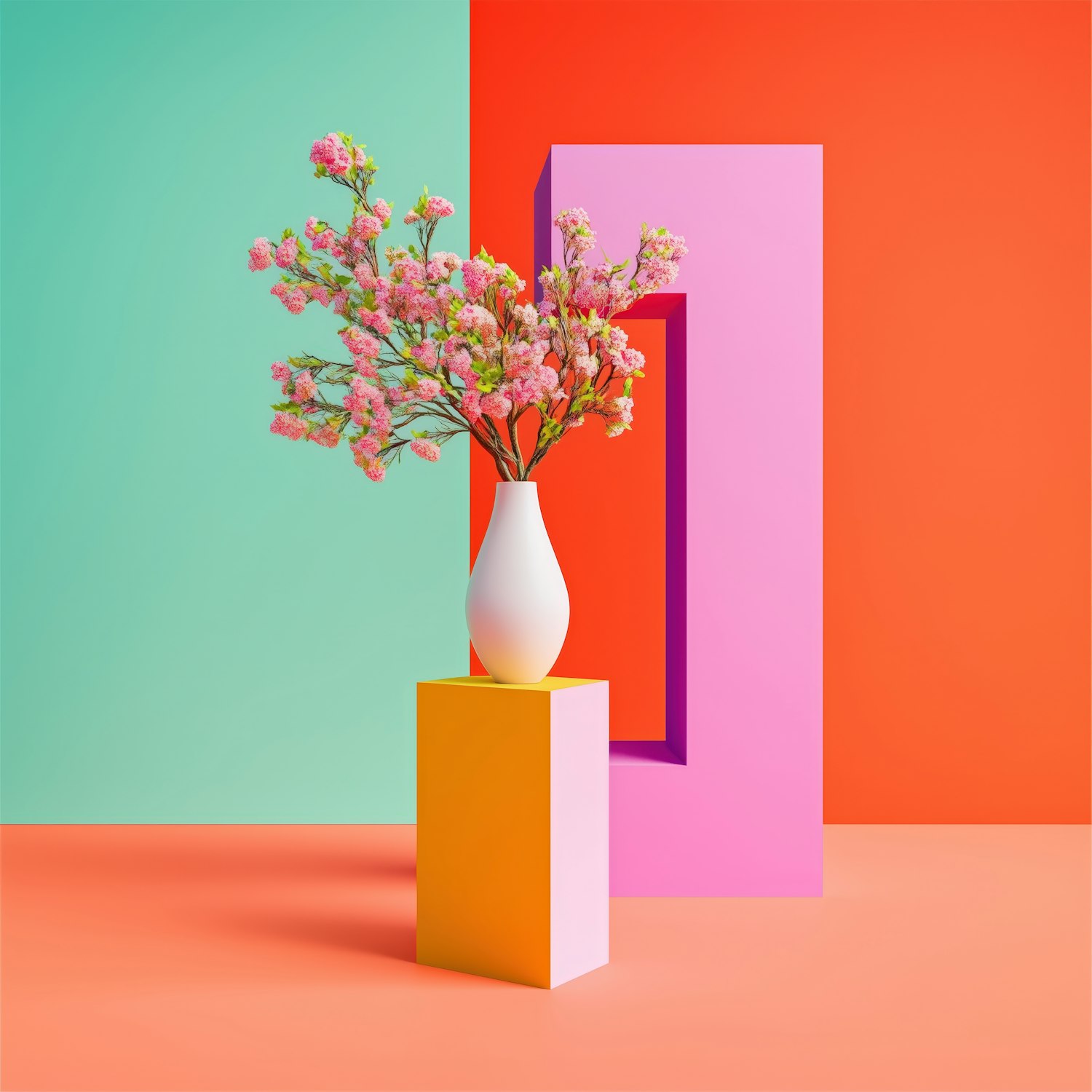Bright still life with a white vase of pink blossoms on a colorful pedestal, set against a bold orange, mint, and pink geometric background.