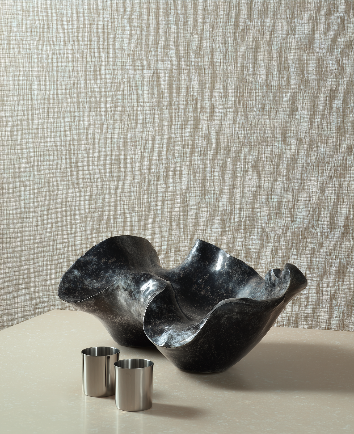 A modern black sculptural bowl with metallic cups on a beige surface, set against a neutral textured wall for a minimalist aesthetic.