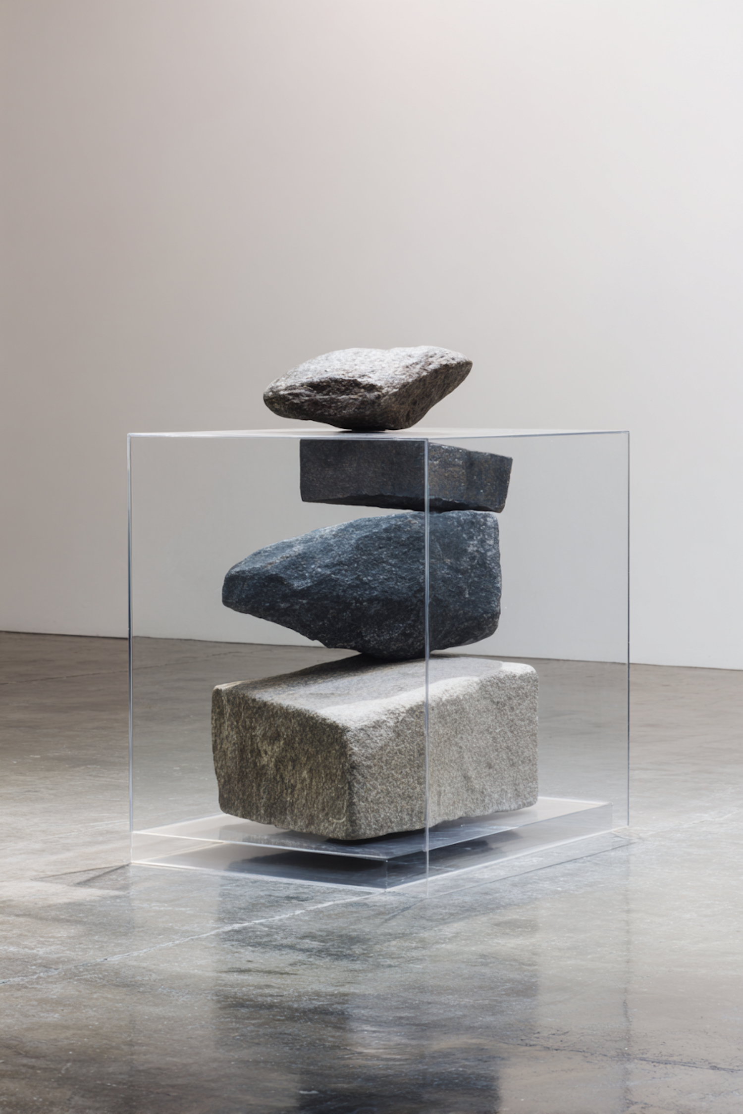 A modern art installation of stacked stones encased in a transparent cube, set on a polished concrete floor in a minimalist space.