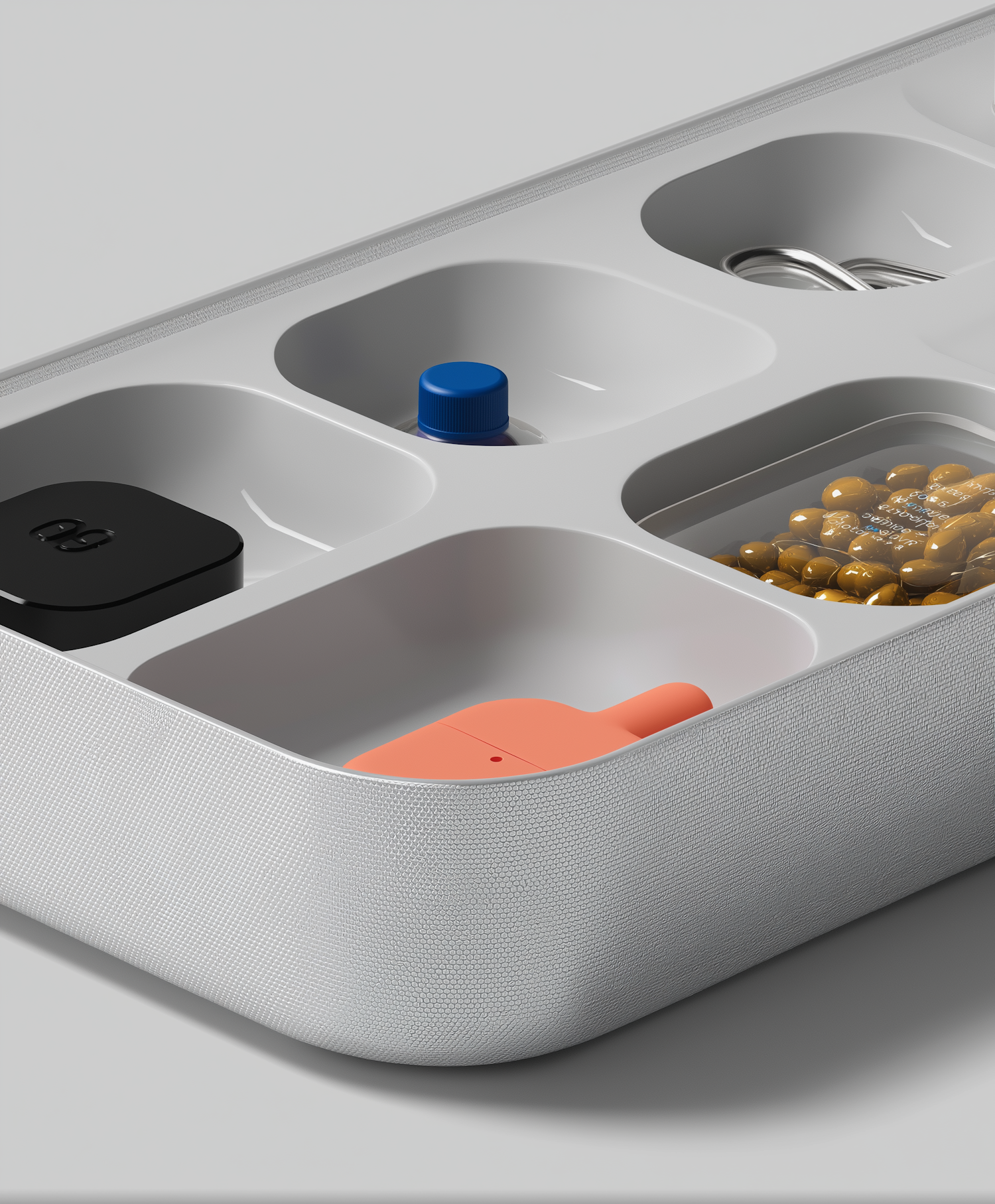 Modern storage tray with compartments holding a black object, blue-capped bottle, golden capsules, and coral device. Sleek and organized.