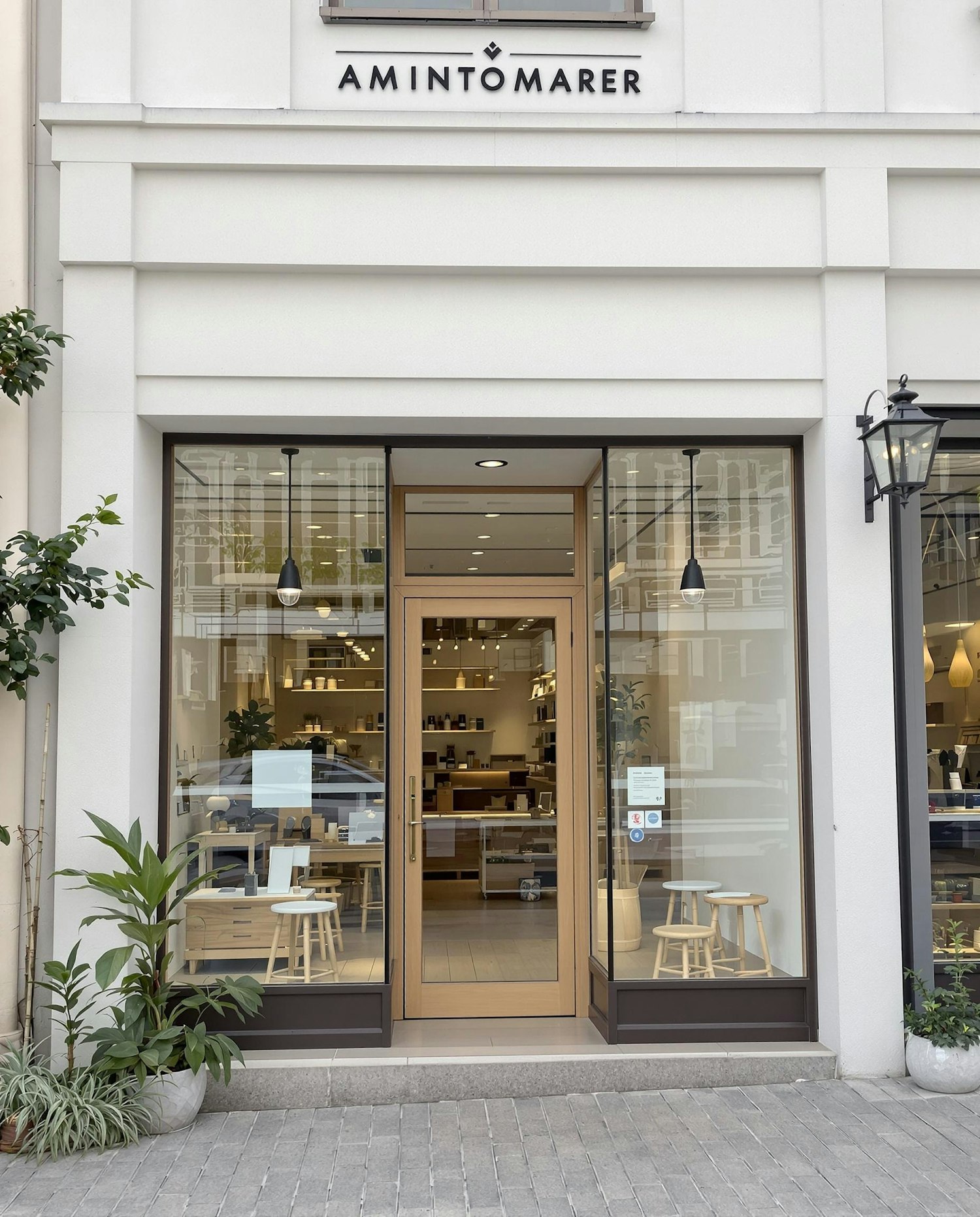 Minimalist storefront with wooden accents, large glass windows, and potted plants. Bright, organized interior with light wooden furniture.