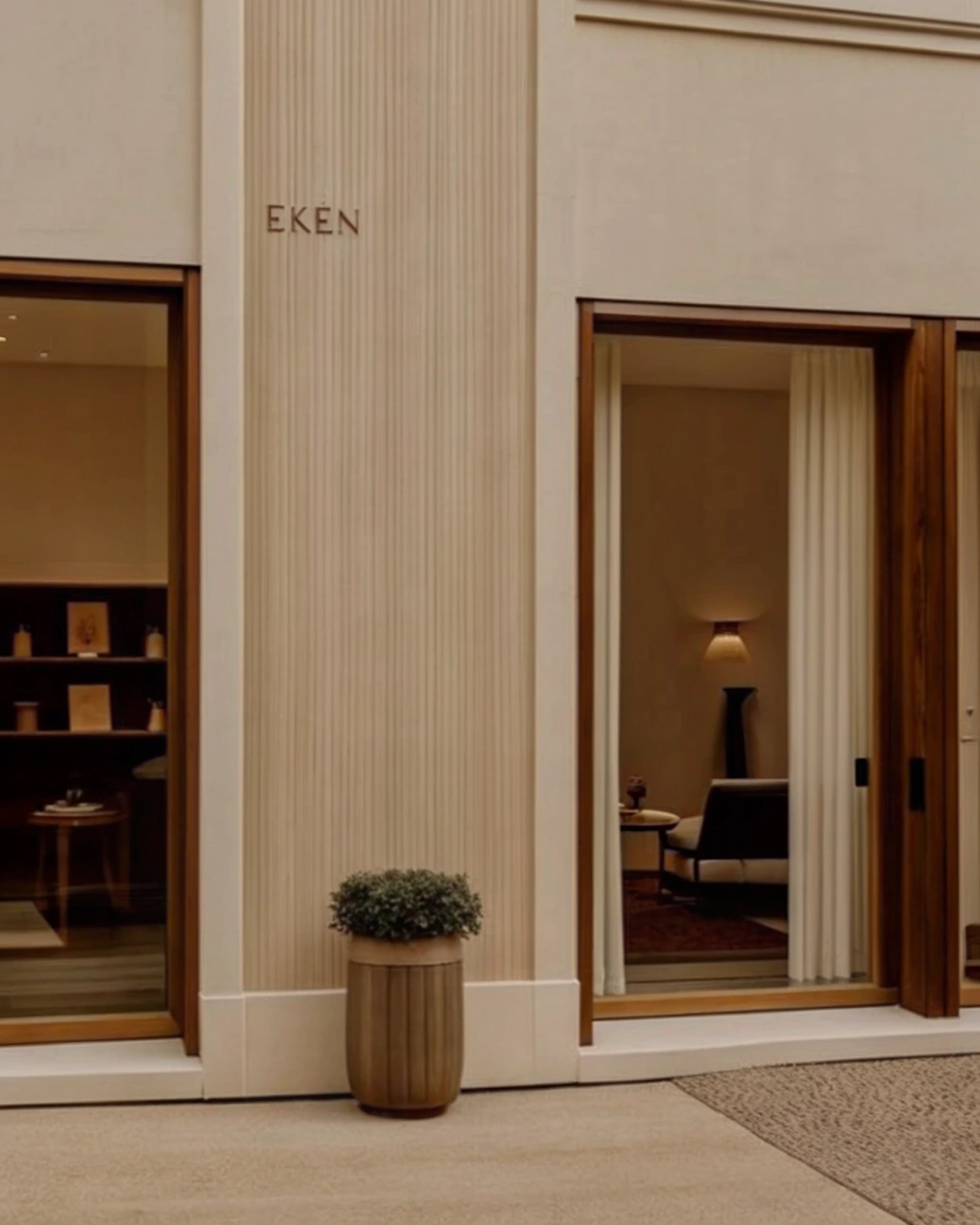 Minimalist storefront with beige facade, wooden-framed glass doors, cozy interior, and a potted plant for a modern, inviting look.
