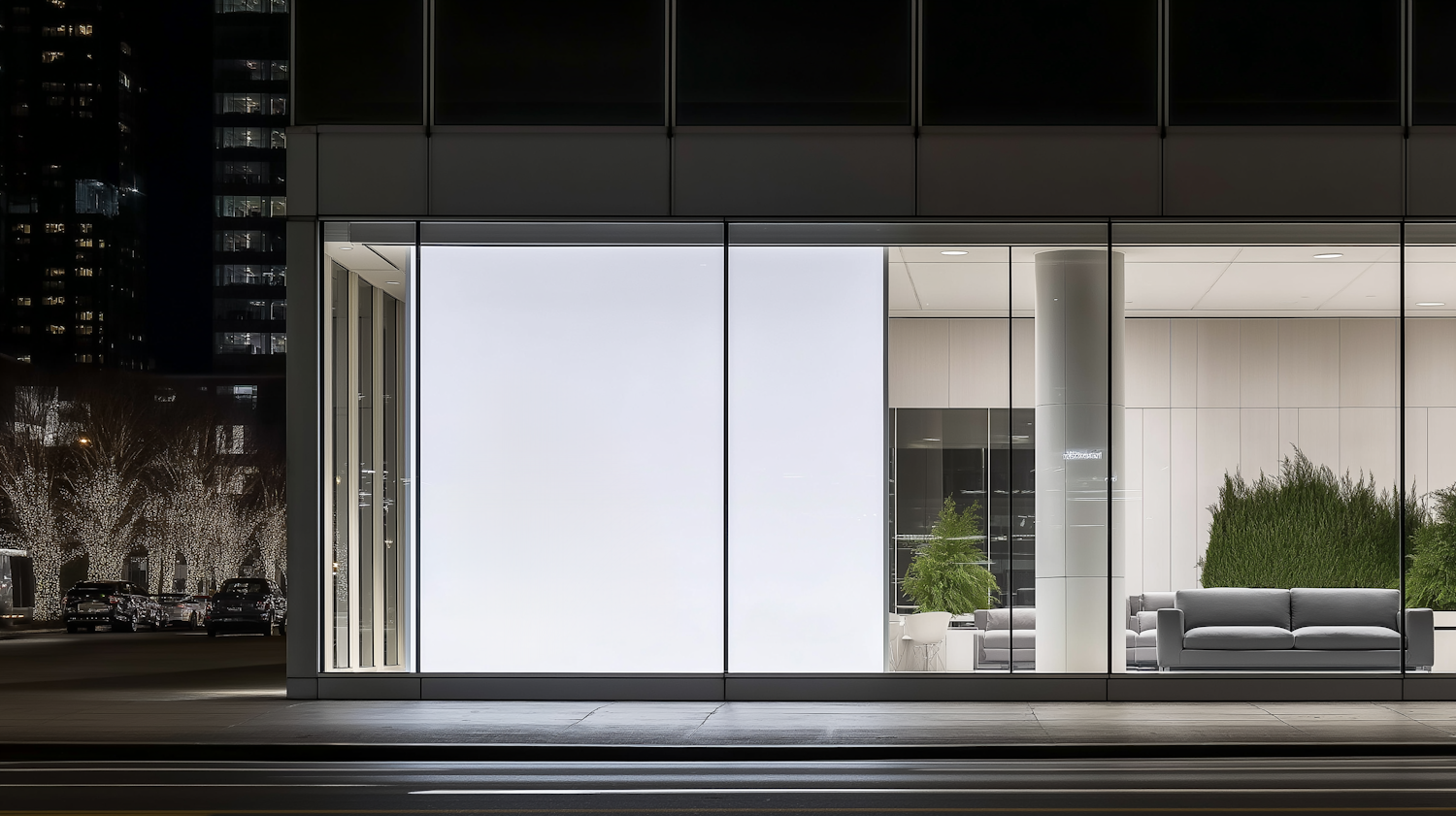 Modern storefront with glass windows, minimalist interior, gray sofa, green plants, and urban nighttime setting with lit trees.