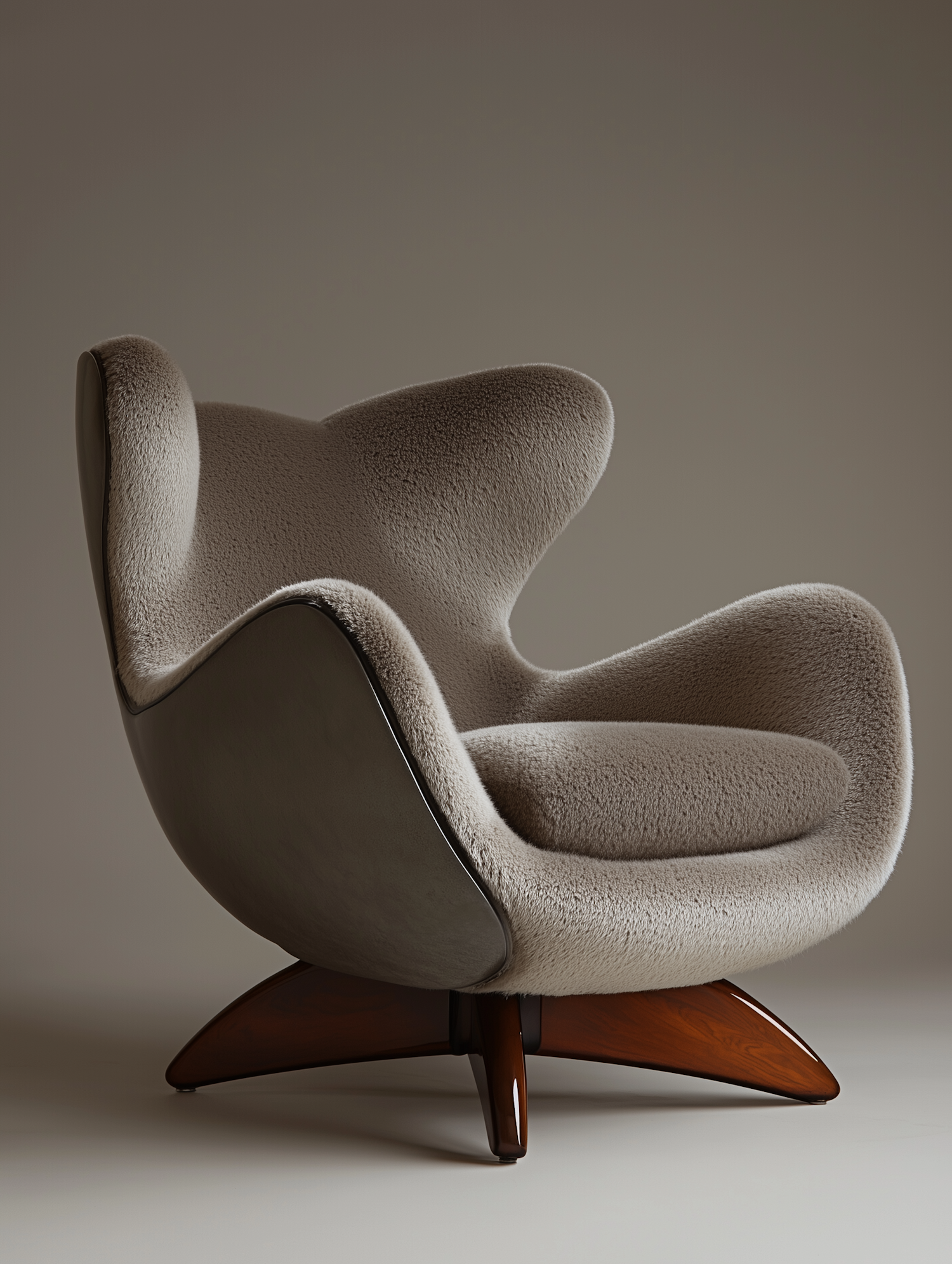 Modern armchair with plush gray fabric and polished wooden base, featuring a seamless, curved design for comfort and style.