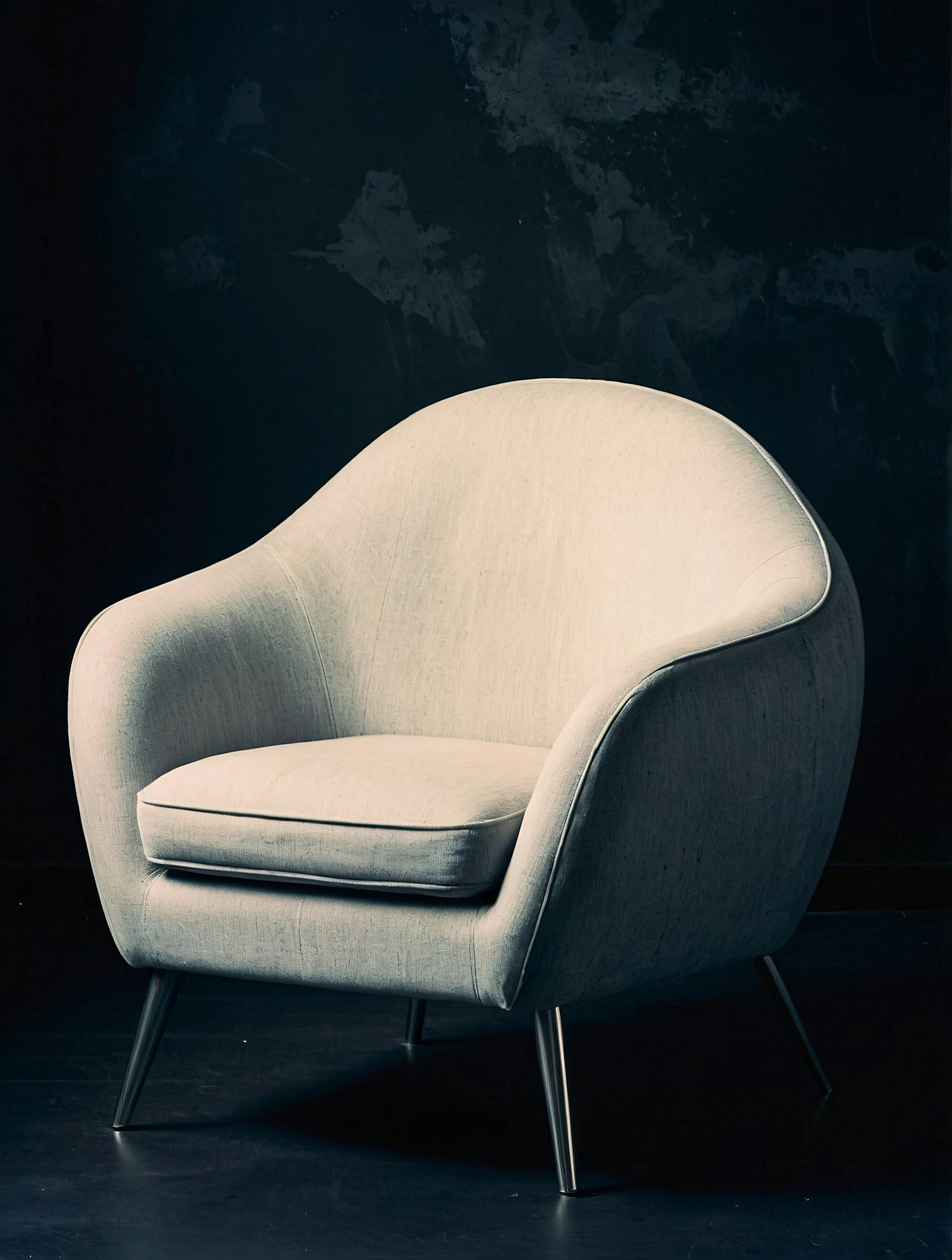Modern light gray armchair with sleek design and metallic legs against a dark background, highlighting its elegant contours.