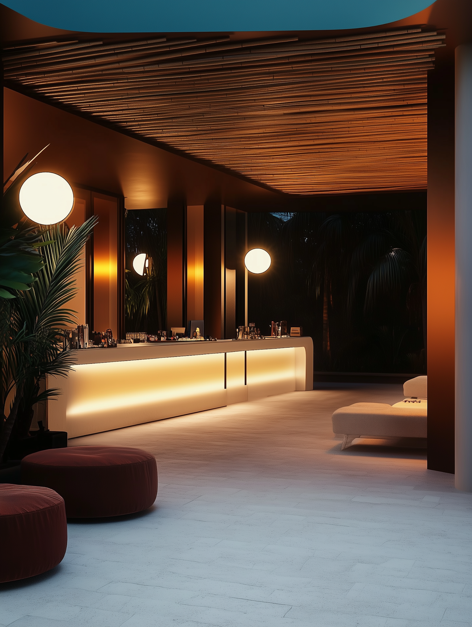 Modern bar interior with warm lighting, wooden accents, and plush seating. Inviting ambiance with elegant design elements.