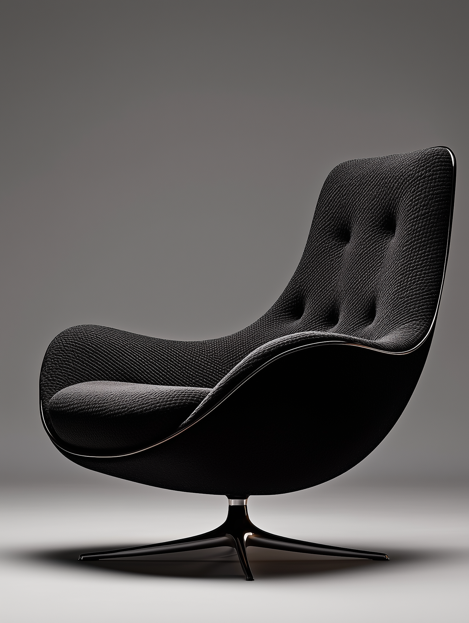 Sleek modern chair with textured black fabric and polished metal base, featuring a contoured design for comfort and style.